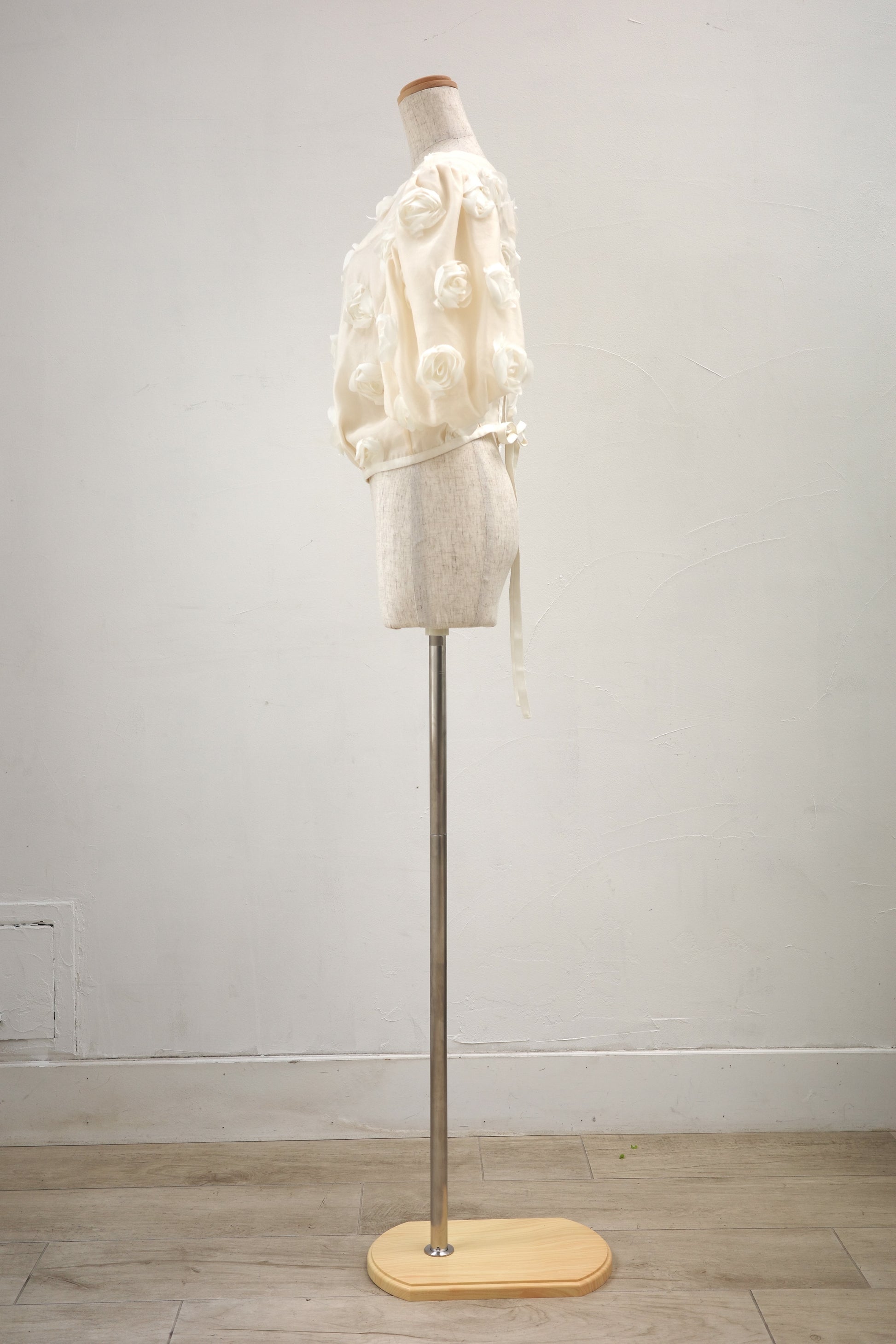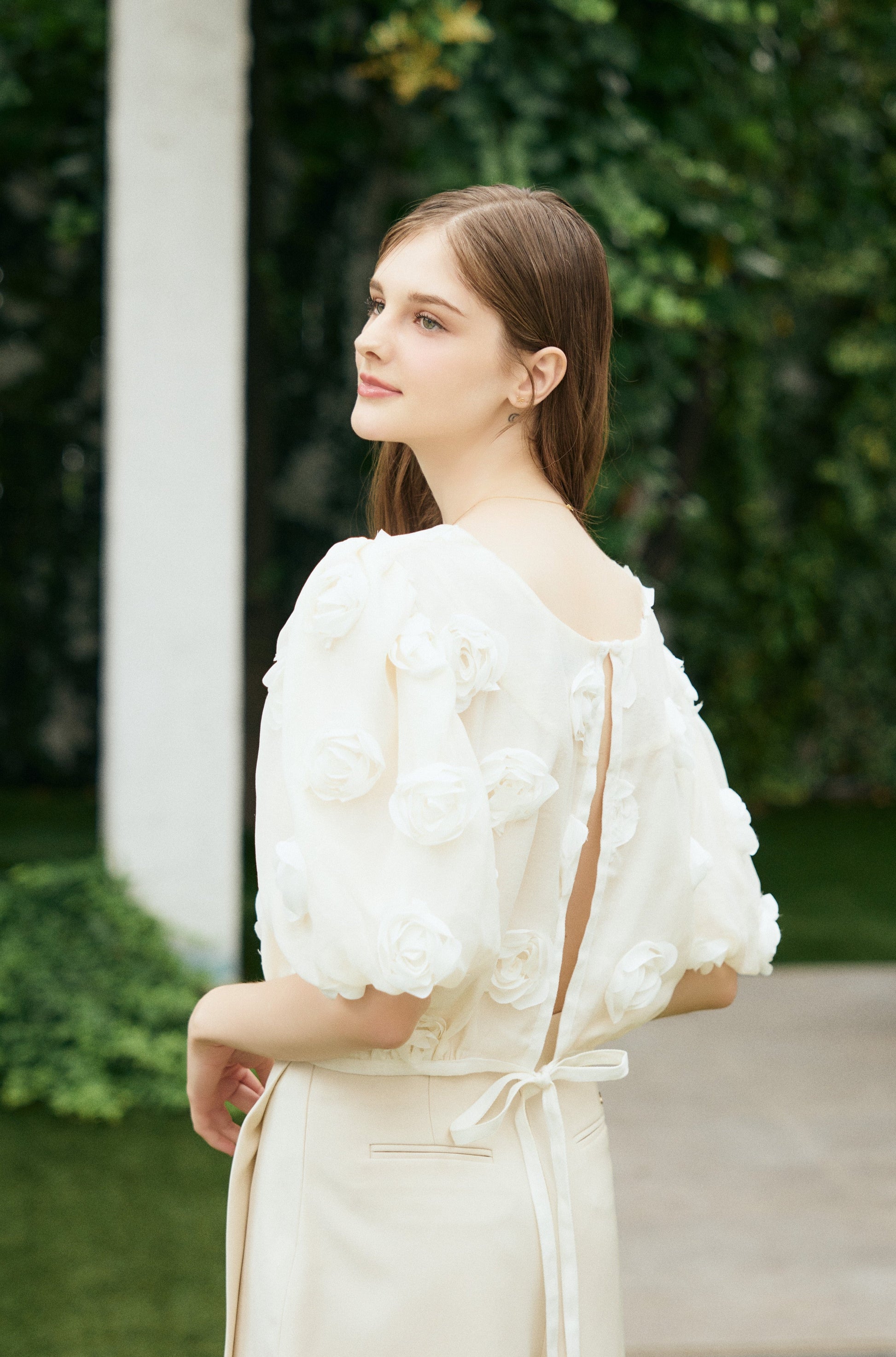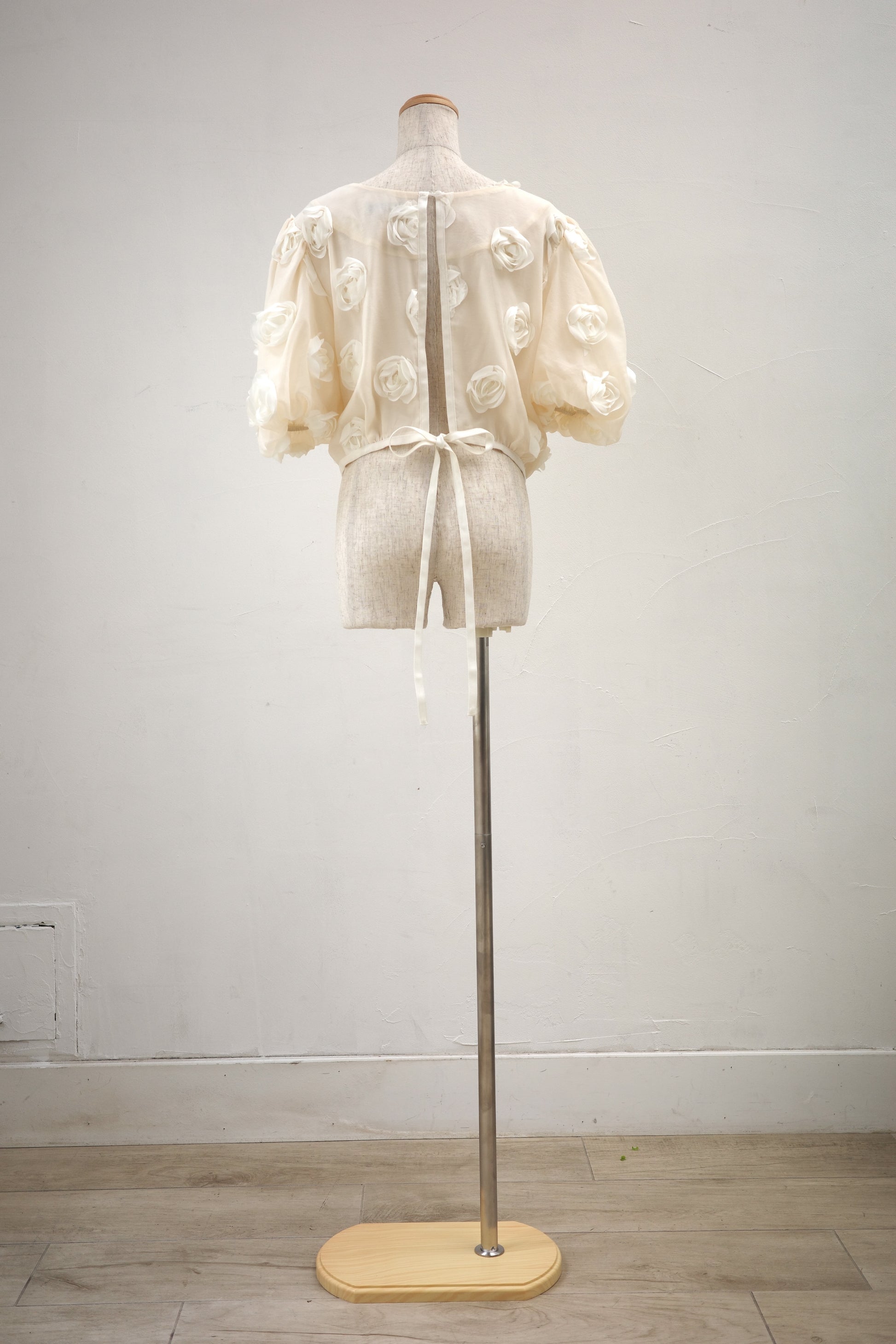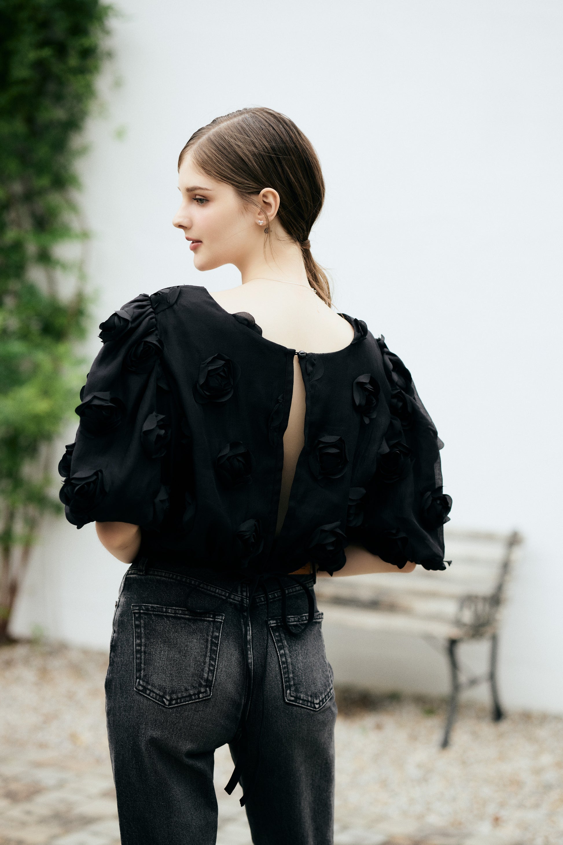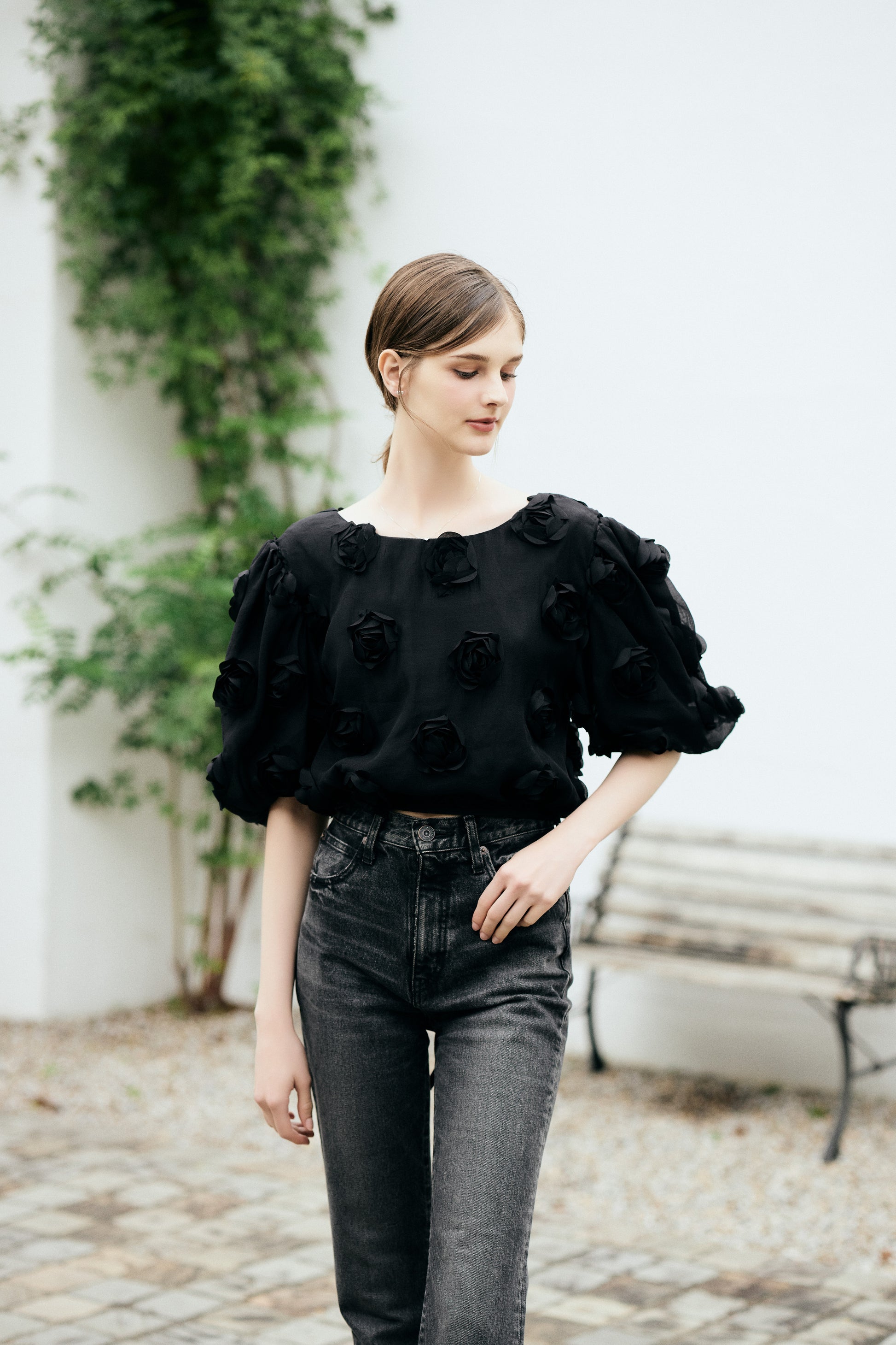立体感のあるローズをたっぷり配置し1枚でコーデの主役に。 背中がぱっくり割れているので、前後で大きく印象が変わり気分を高めてくれます。 たっぷりボリューム感のあるトップスなので、 合わせるボトムはミニ丈やフレアデニムなどスッキリしたアイテムがおすすめです。