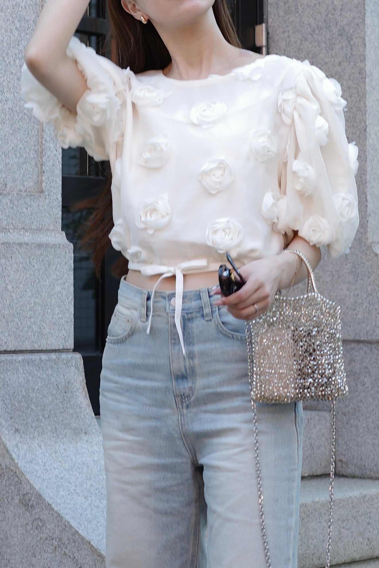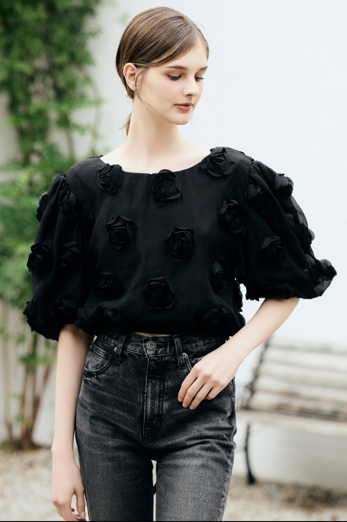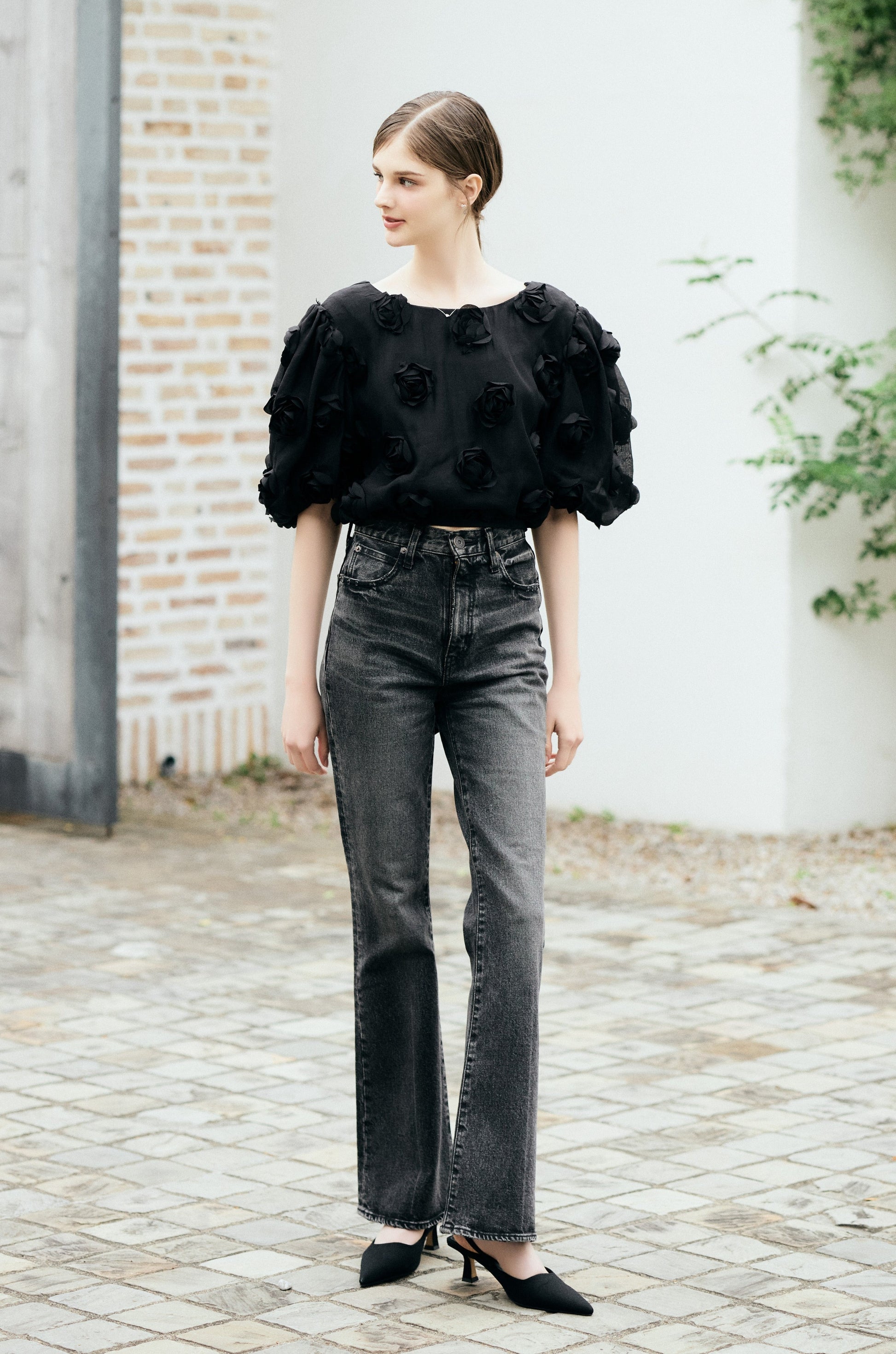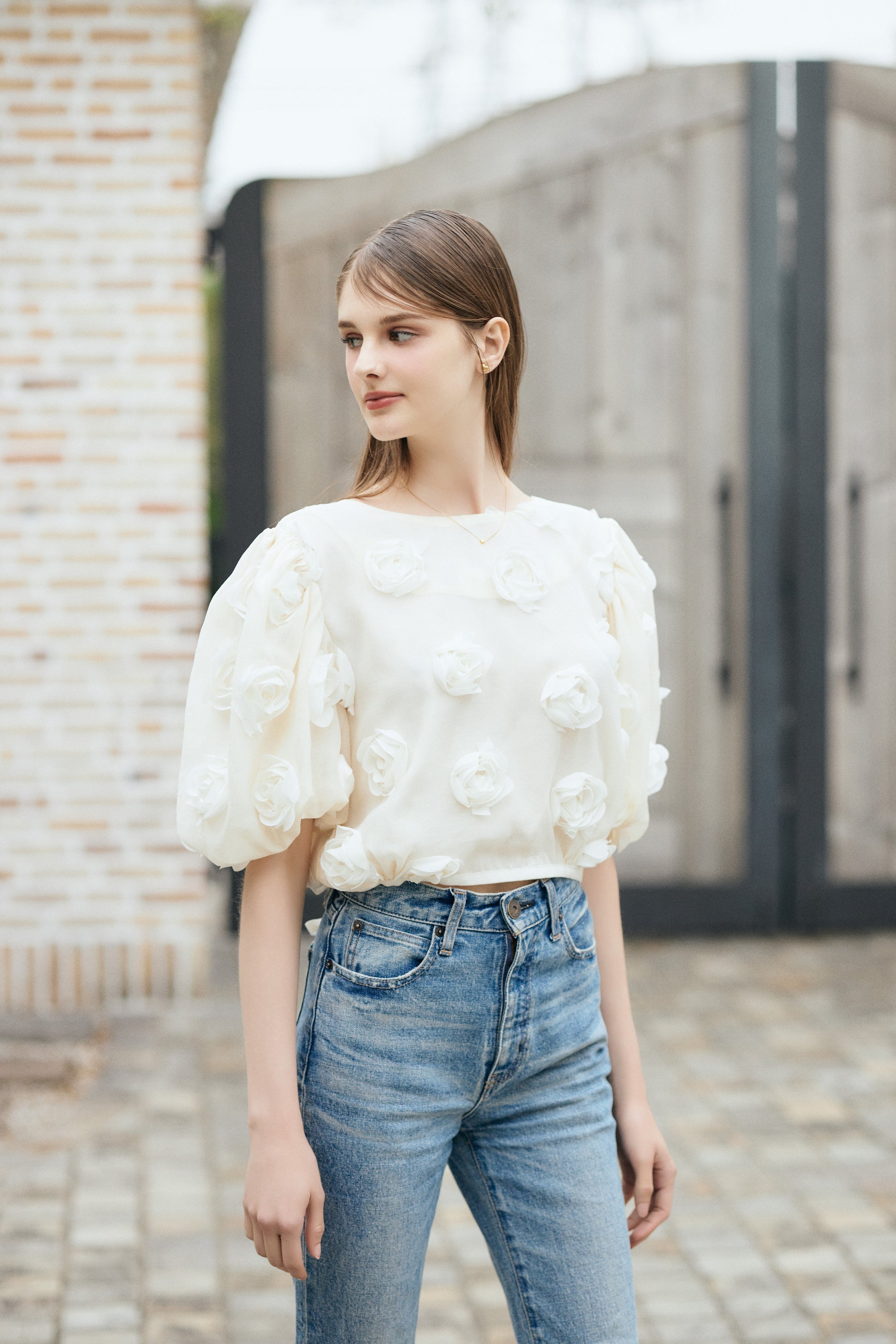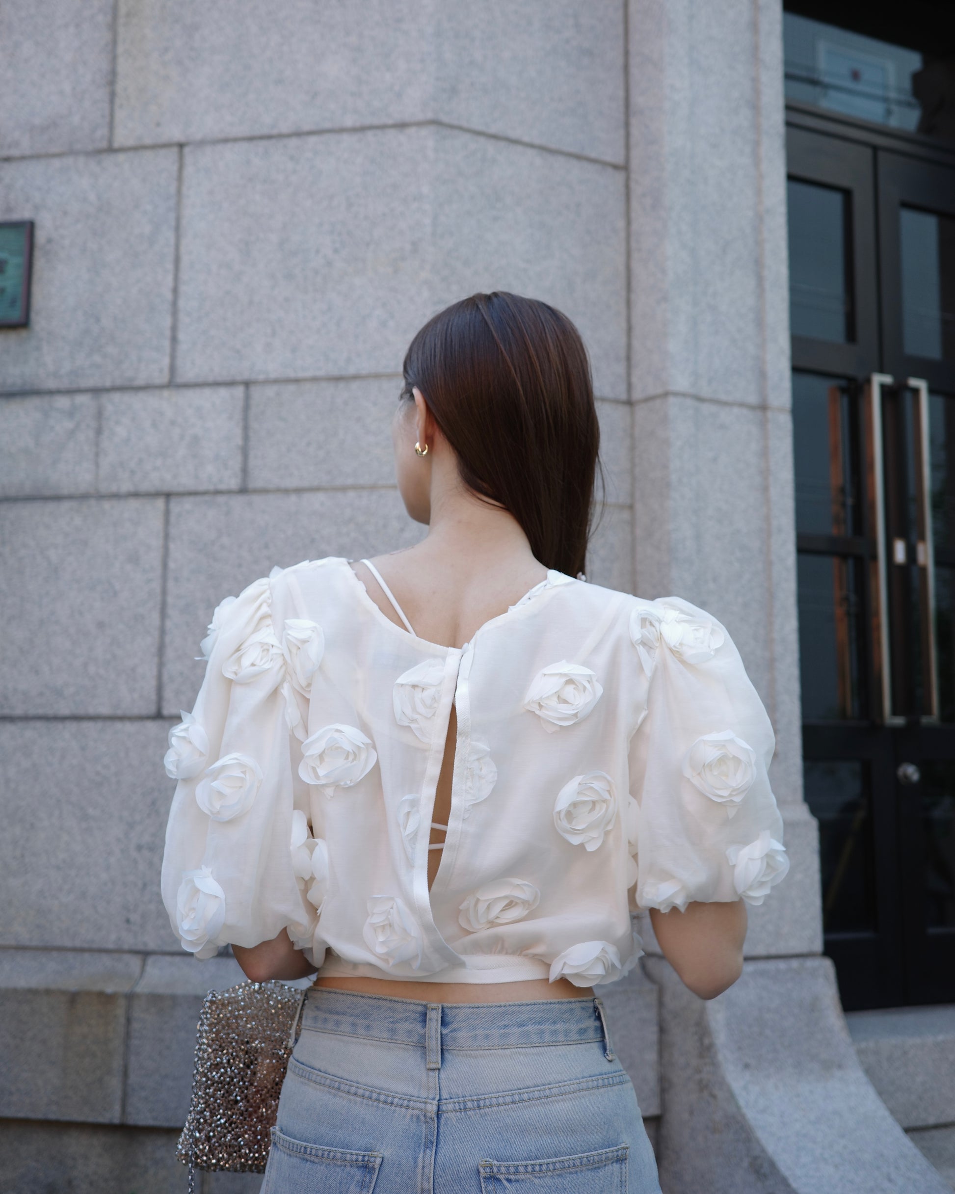 立体感のあるローズをたっぷり配置し1枚でコーデの主役に。 背中がぱっくり割れているので、前後で大きく印象が変わり気分を高めてくれます。 たっぷりボリューム感のあるトップスなので、 合わせるボトムはミニ丈やフレアデニムなどスッキリしたアイテムがおすすめです。
