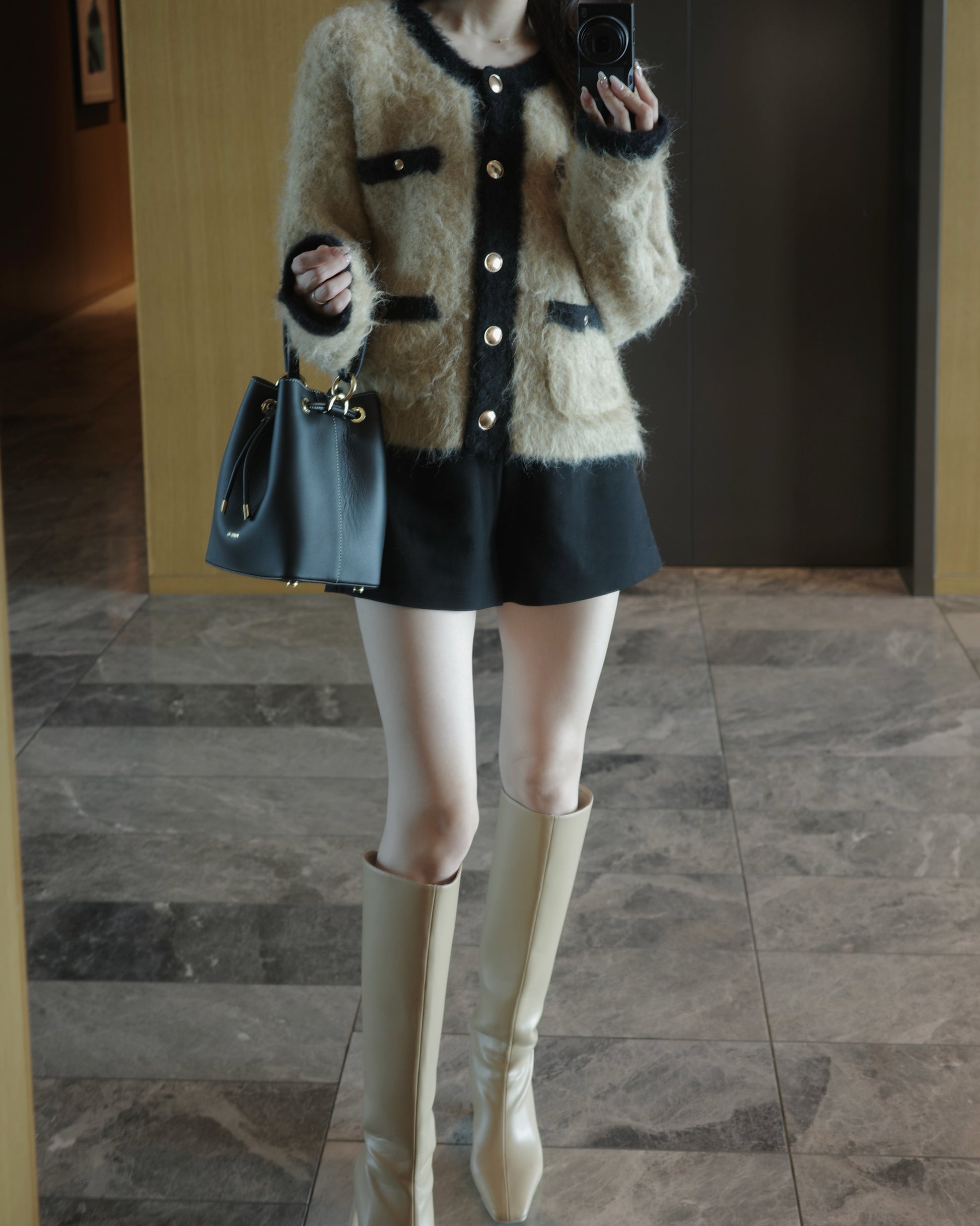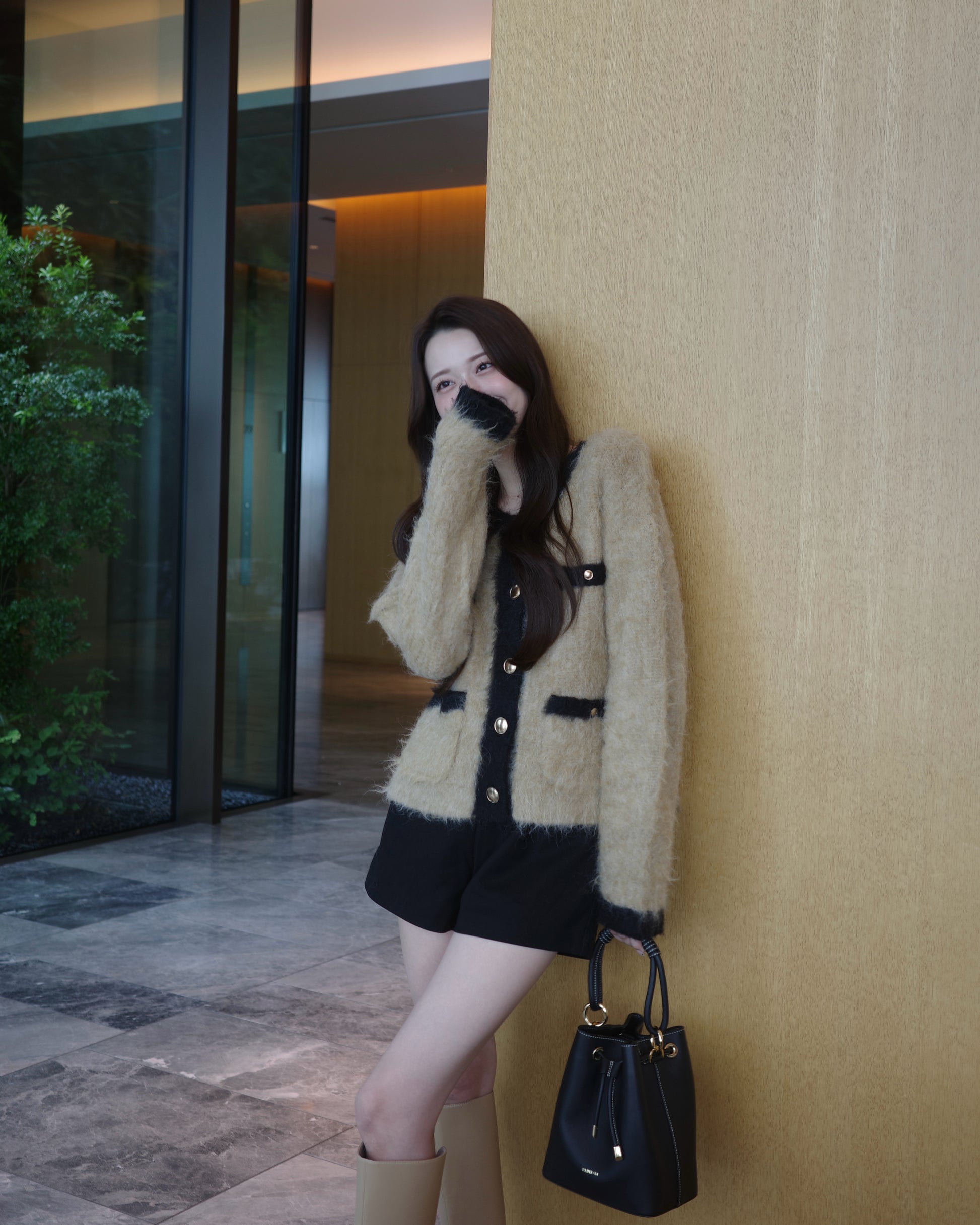 冬らしいふわっと上質なノーカラーニットジャケット