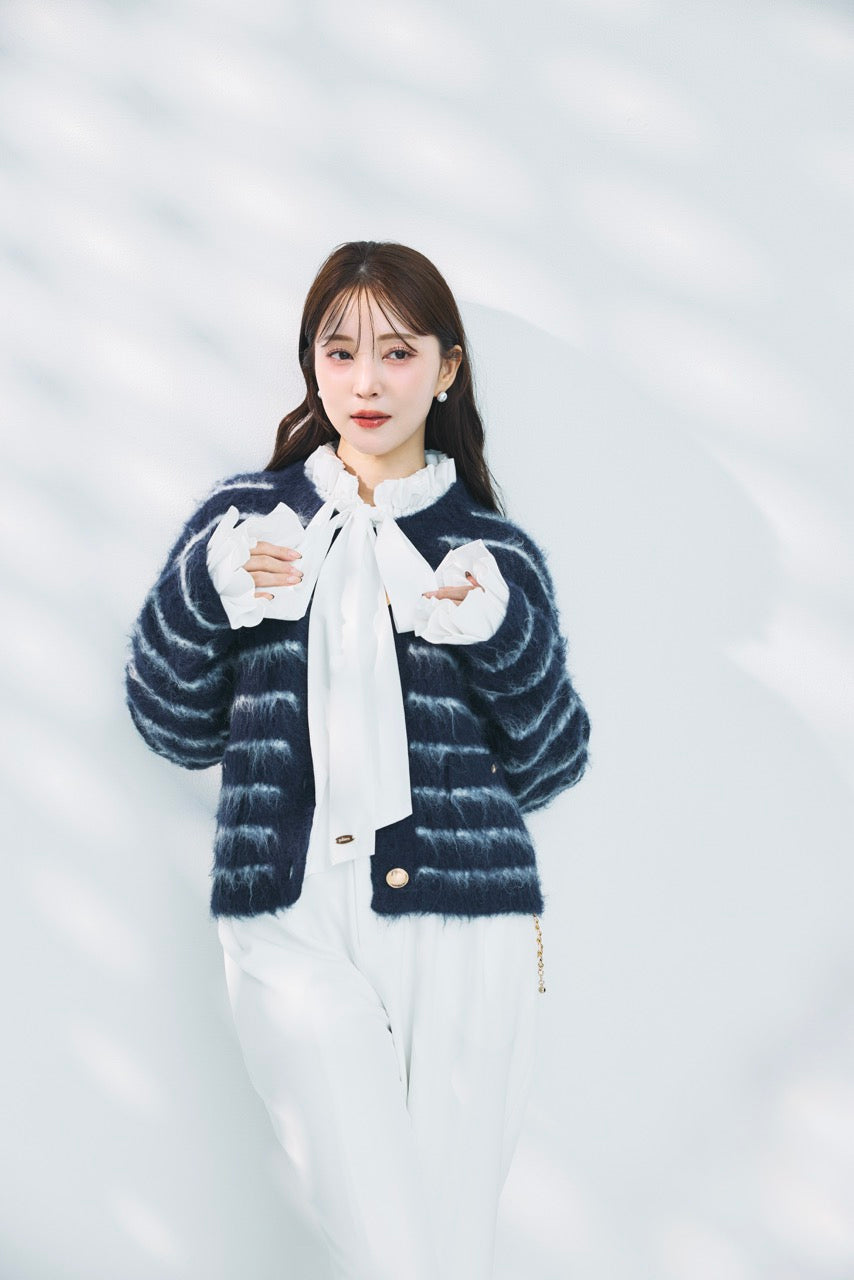 首元のリボンをゆるく結べばオフショルダーとして抜け感を演出、きゅっと結べばクラシカルなハイネックブラウスに。