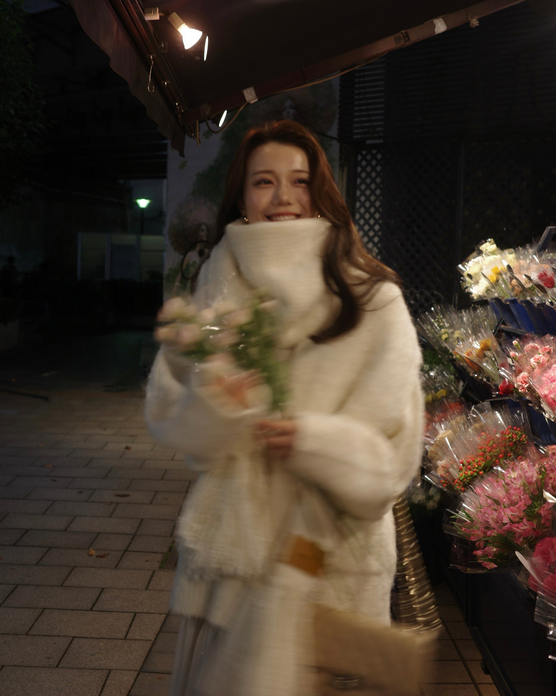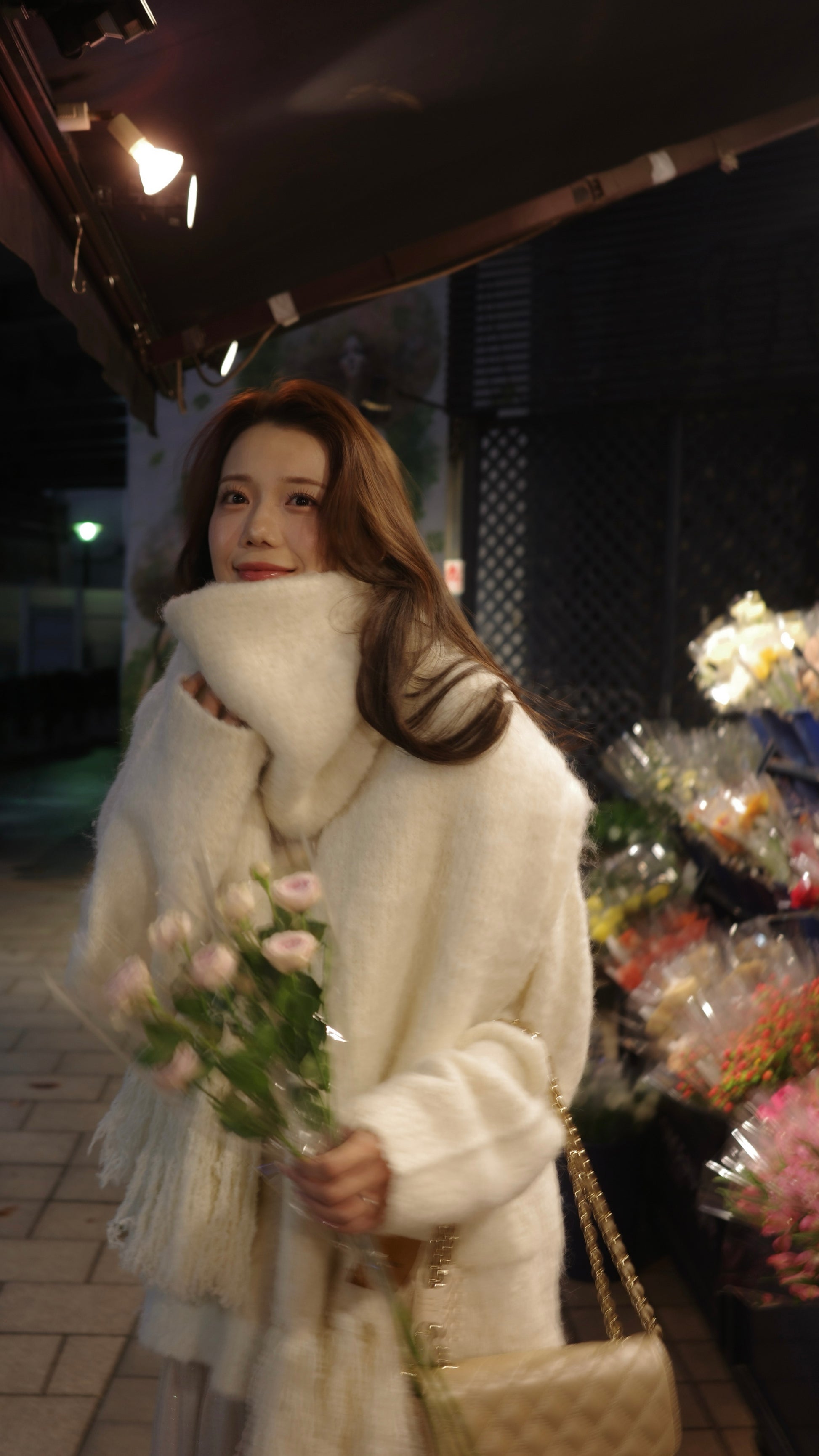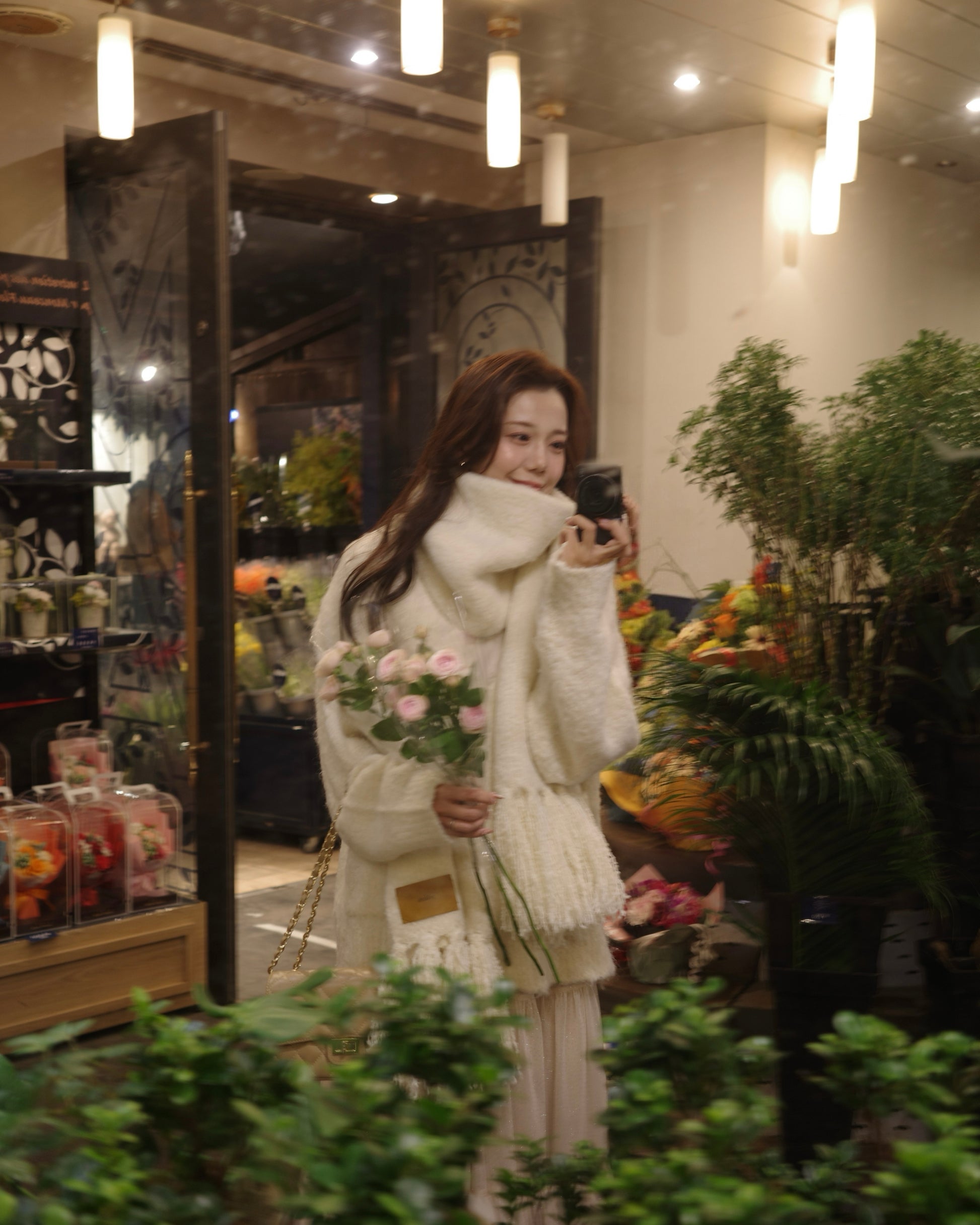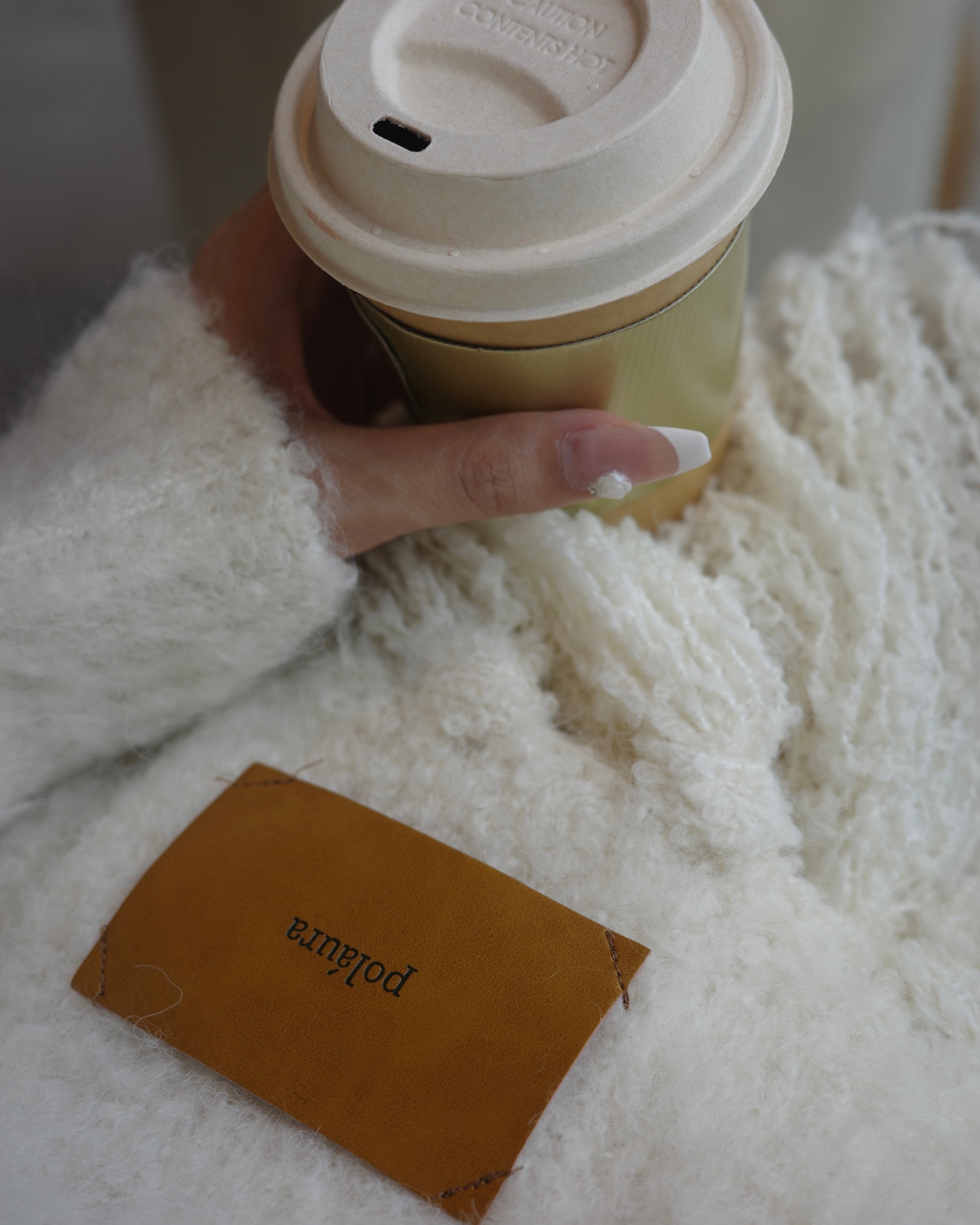 寒さが増す季節には、同素材で編み上げたボリュームたっぷりのマフラーをプラスすることで、防寒と華やかさを両立。
