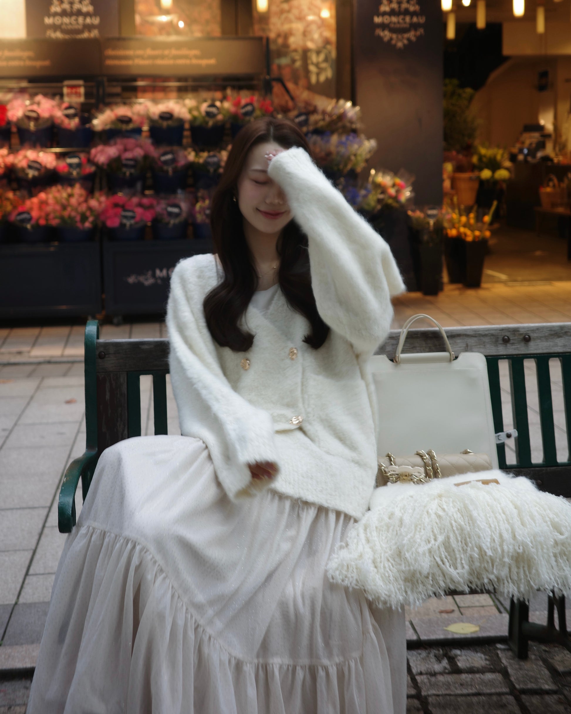 毛足の長いふわっとした質感が魅力のオーバーサイズカーディガンに、ニュアンスのあるゴールドボタンをあしらった1着。