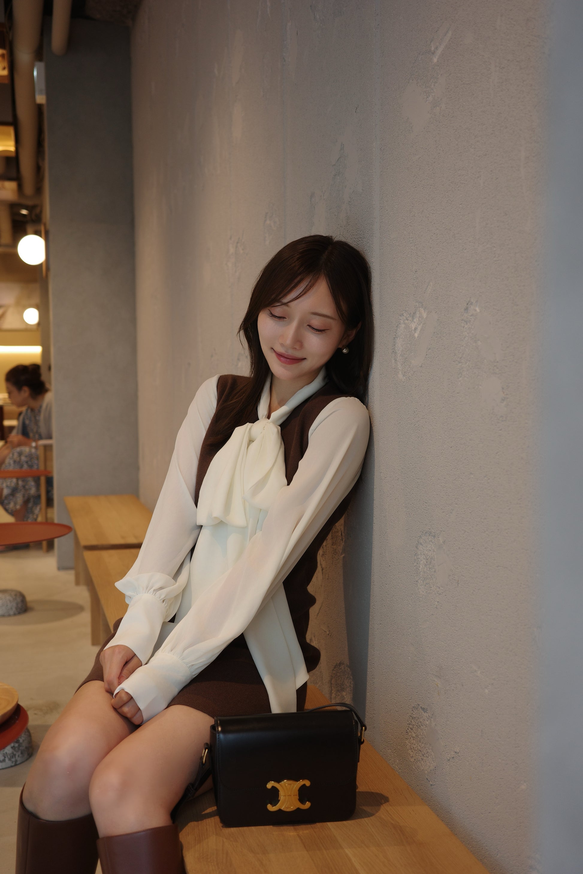 フロントにあしらった大きなリボンは、裾を鋭角にカットすることで動きと立体感が生まれ、コーディネートの主役になる存在感を放ちます。