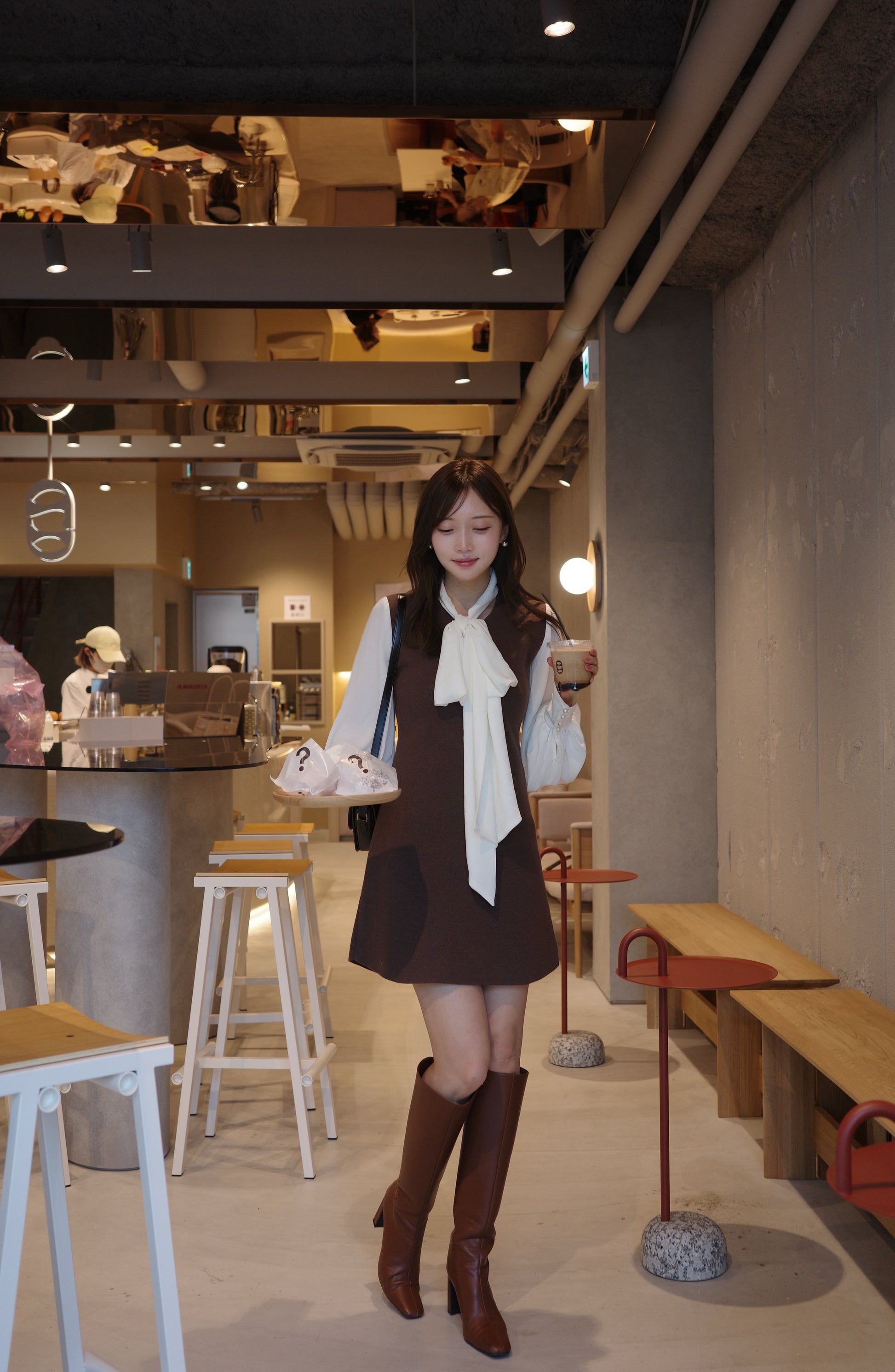 ブラウスとニットを組み合わせたドッキングデザインワンピース。