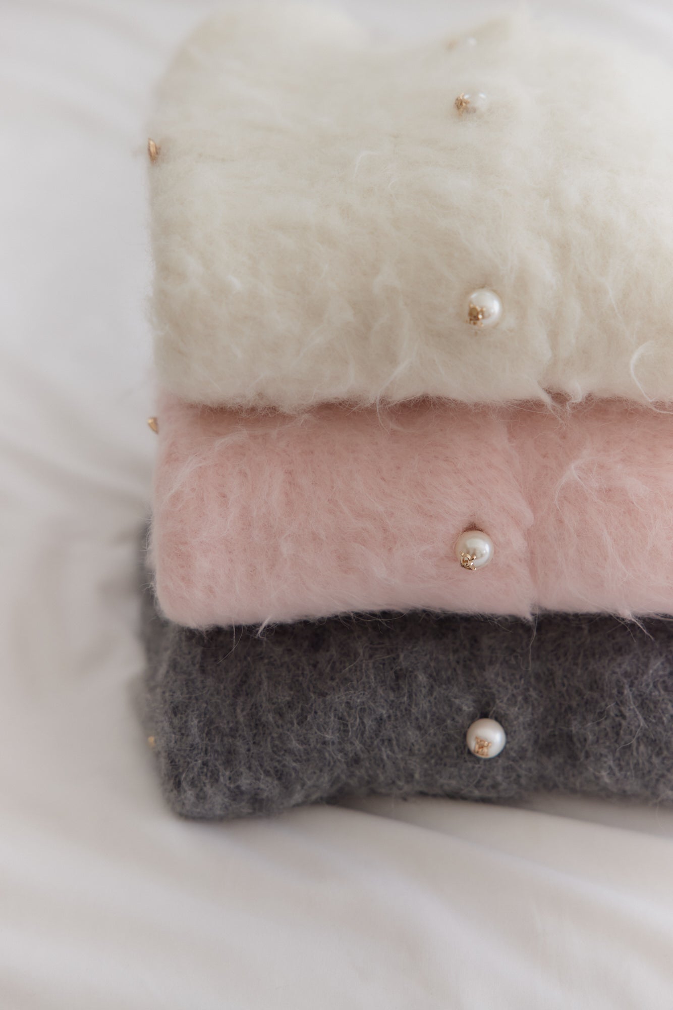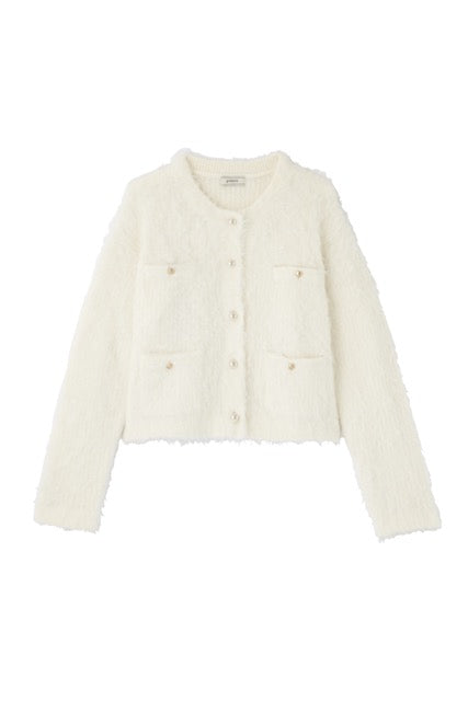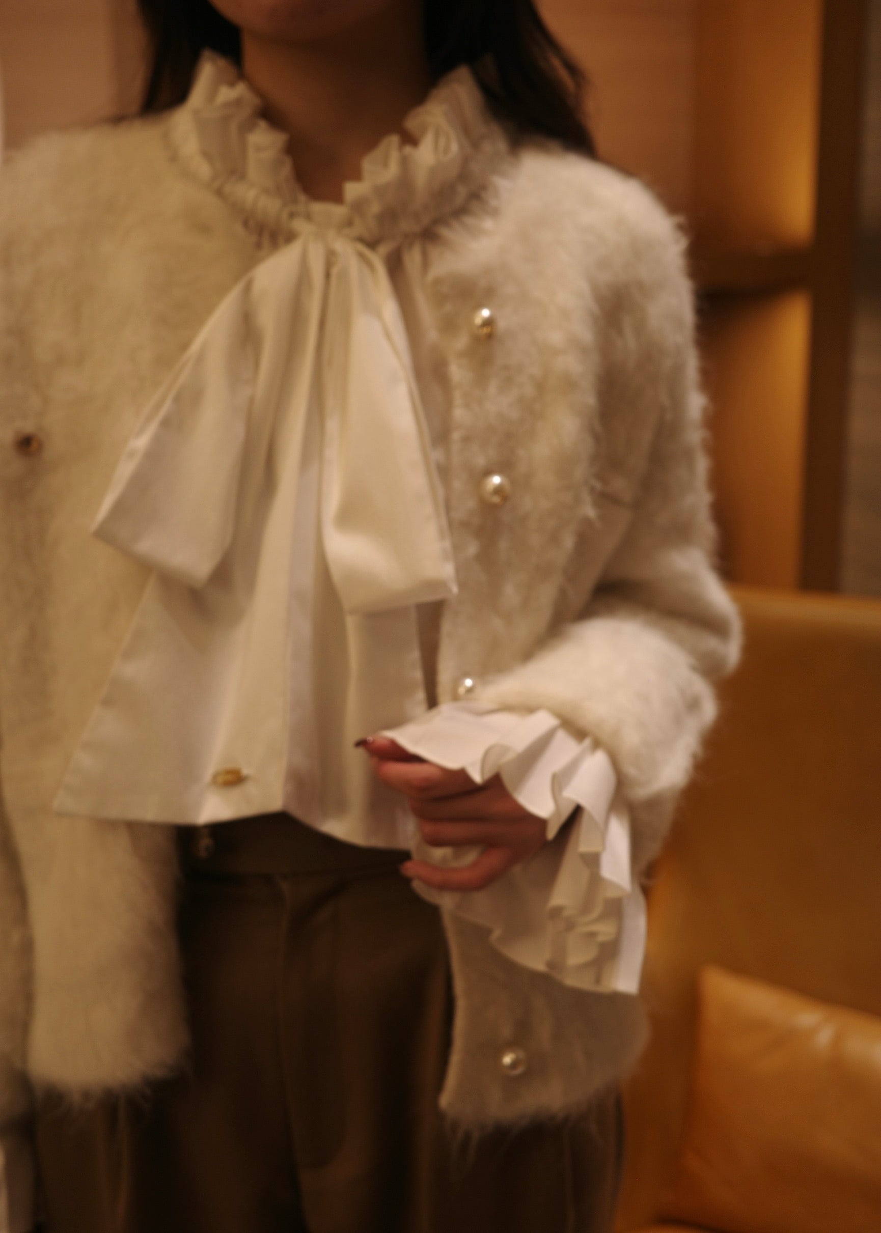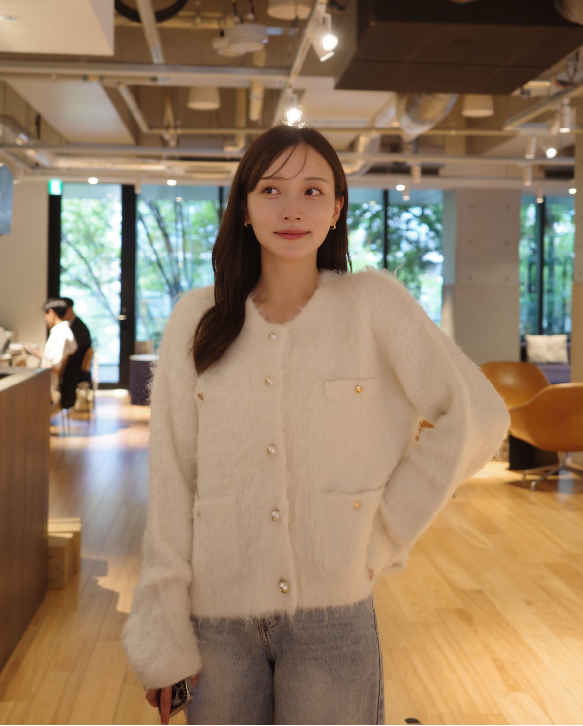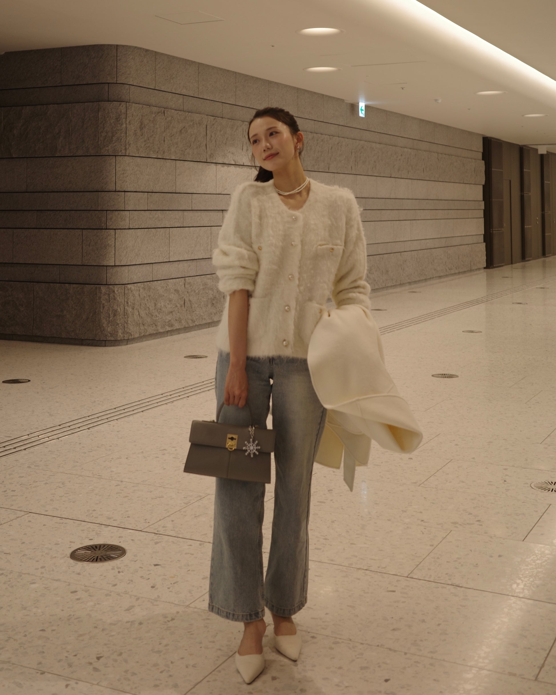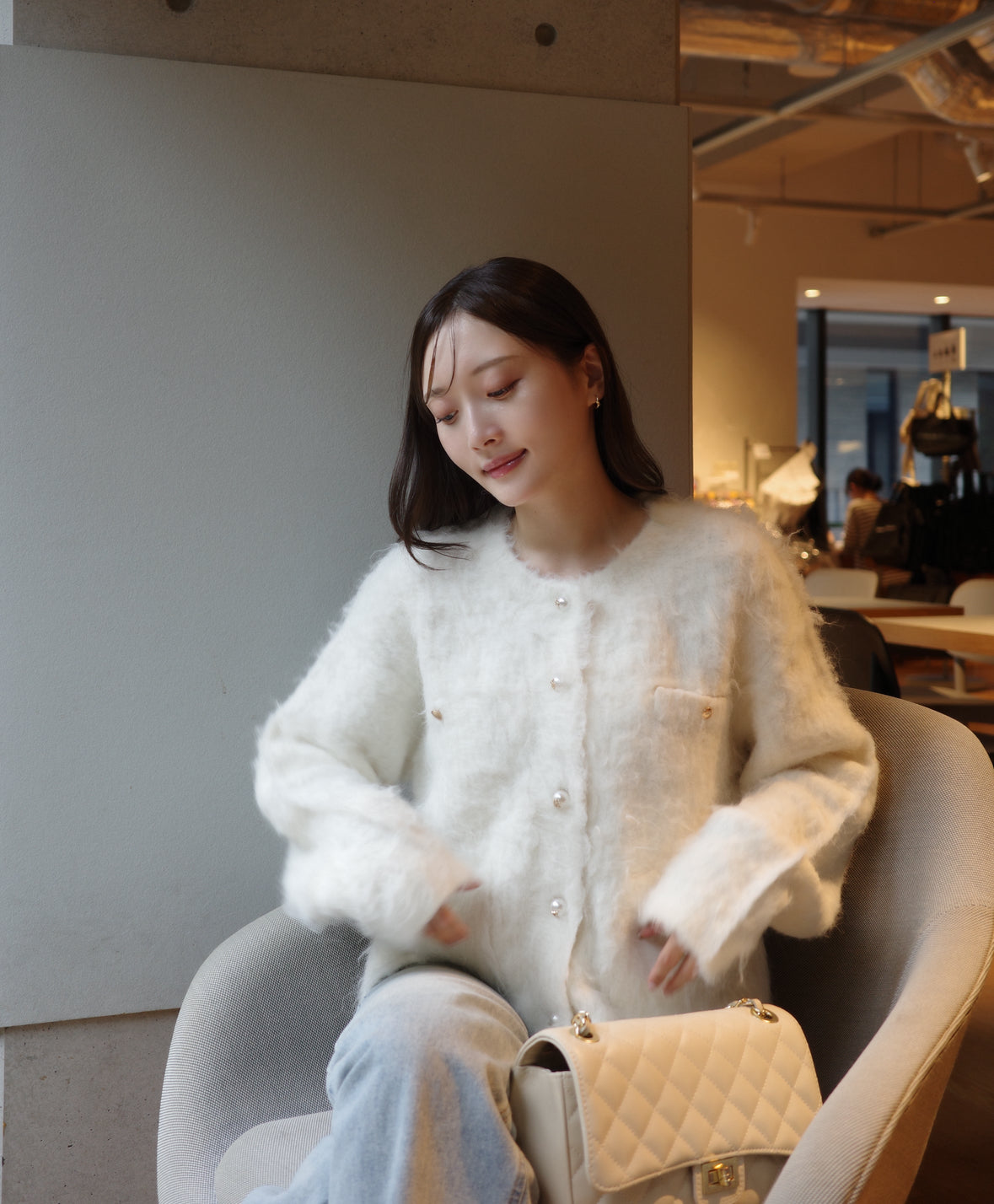 フロントには大ぶりのpoláuraオリジナルパール釦をあしらい、羽織るだけで華やかさをプラスする主役級アイテム。