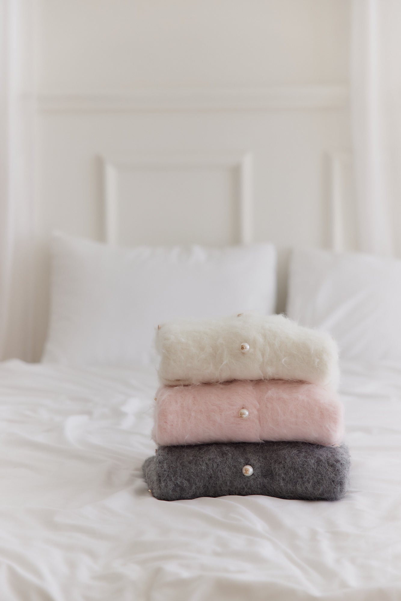 アルパカ混の高品質な糸をふっくらと編み立て、さらに起毛加工を施すことでリッチなボリューム感と柔らかさを実現。
