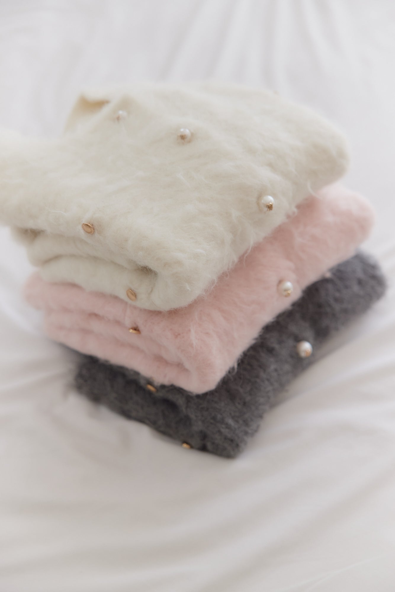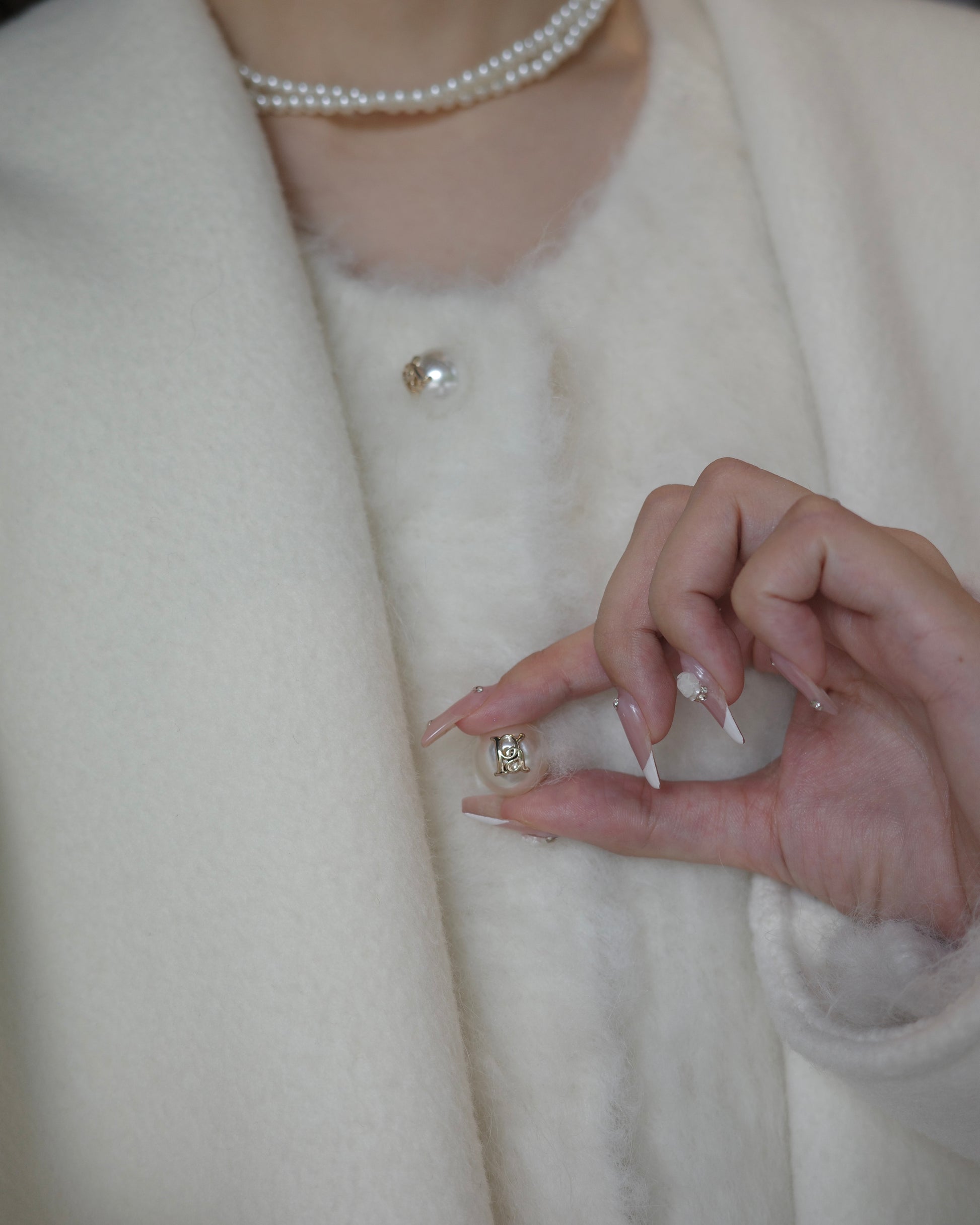 ・poláuraオリジナルの大ぶりパールボタンで華やかさを演出