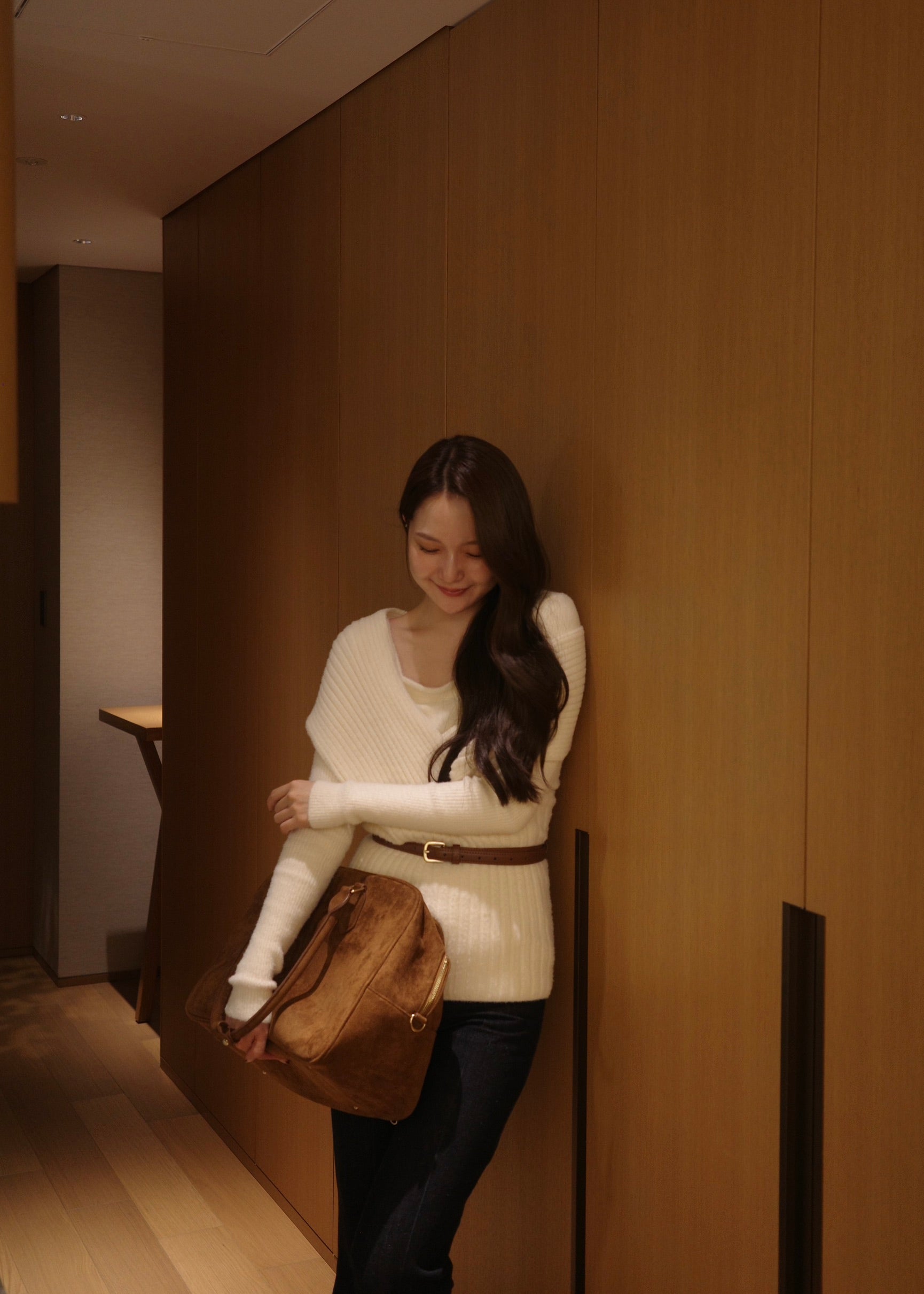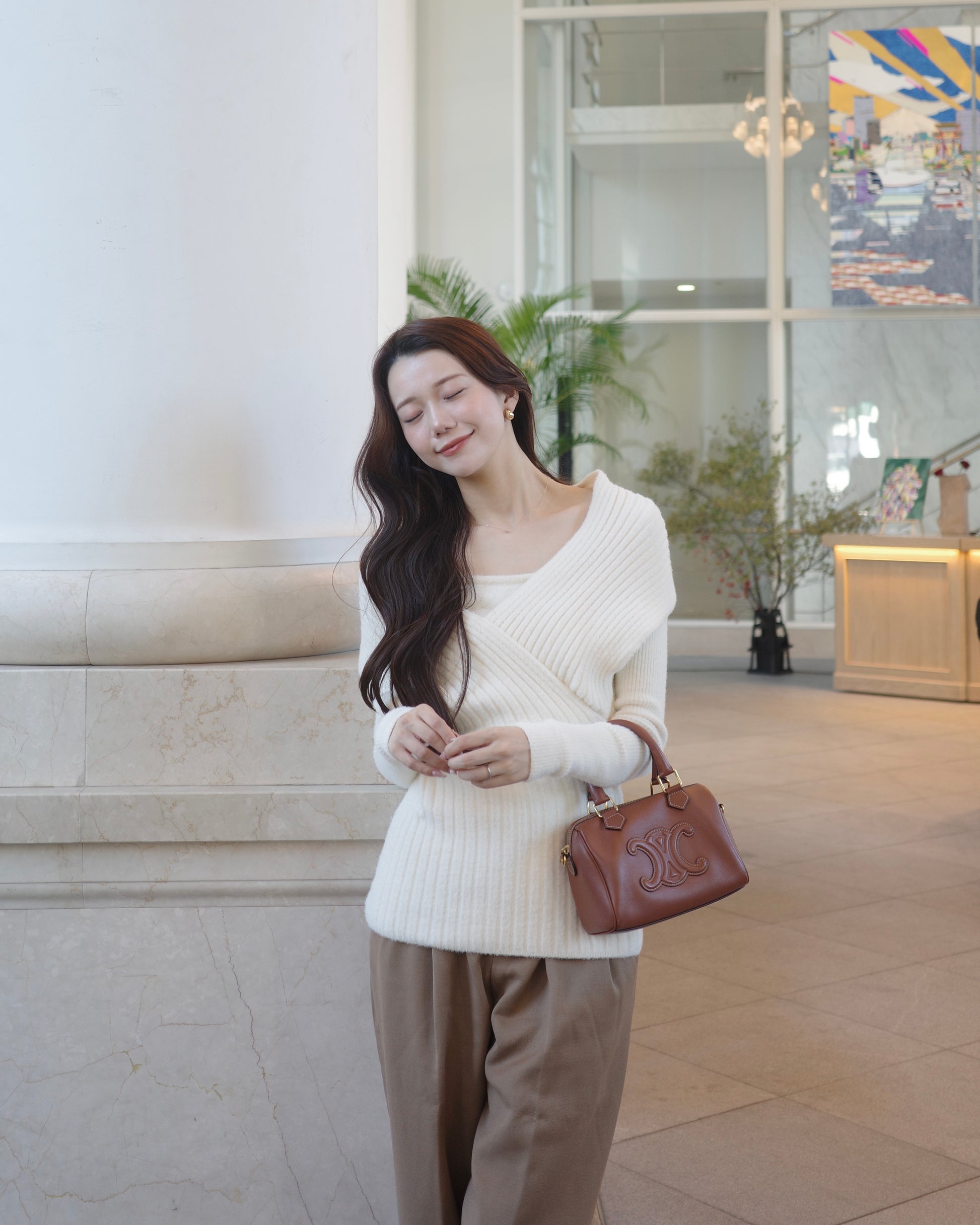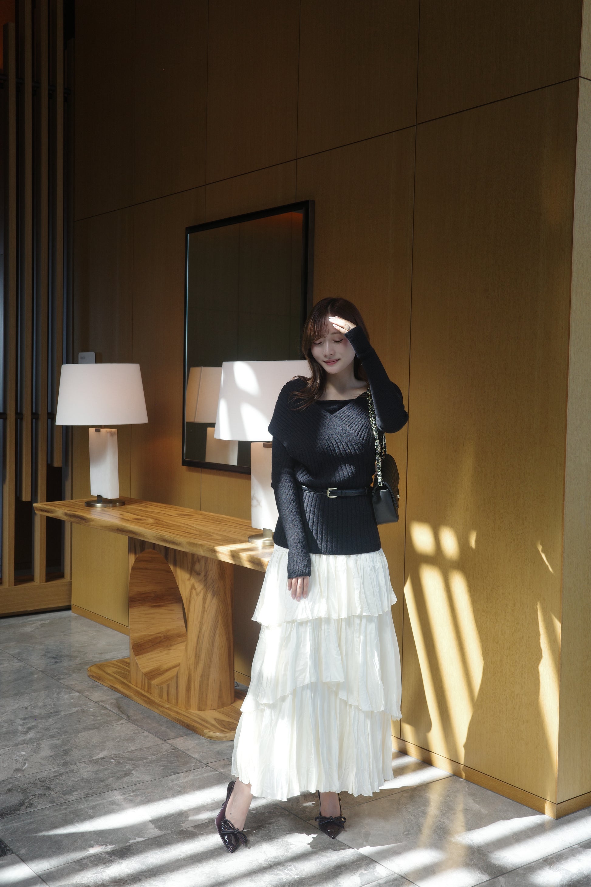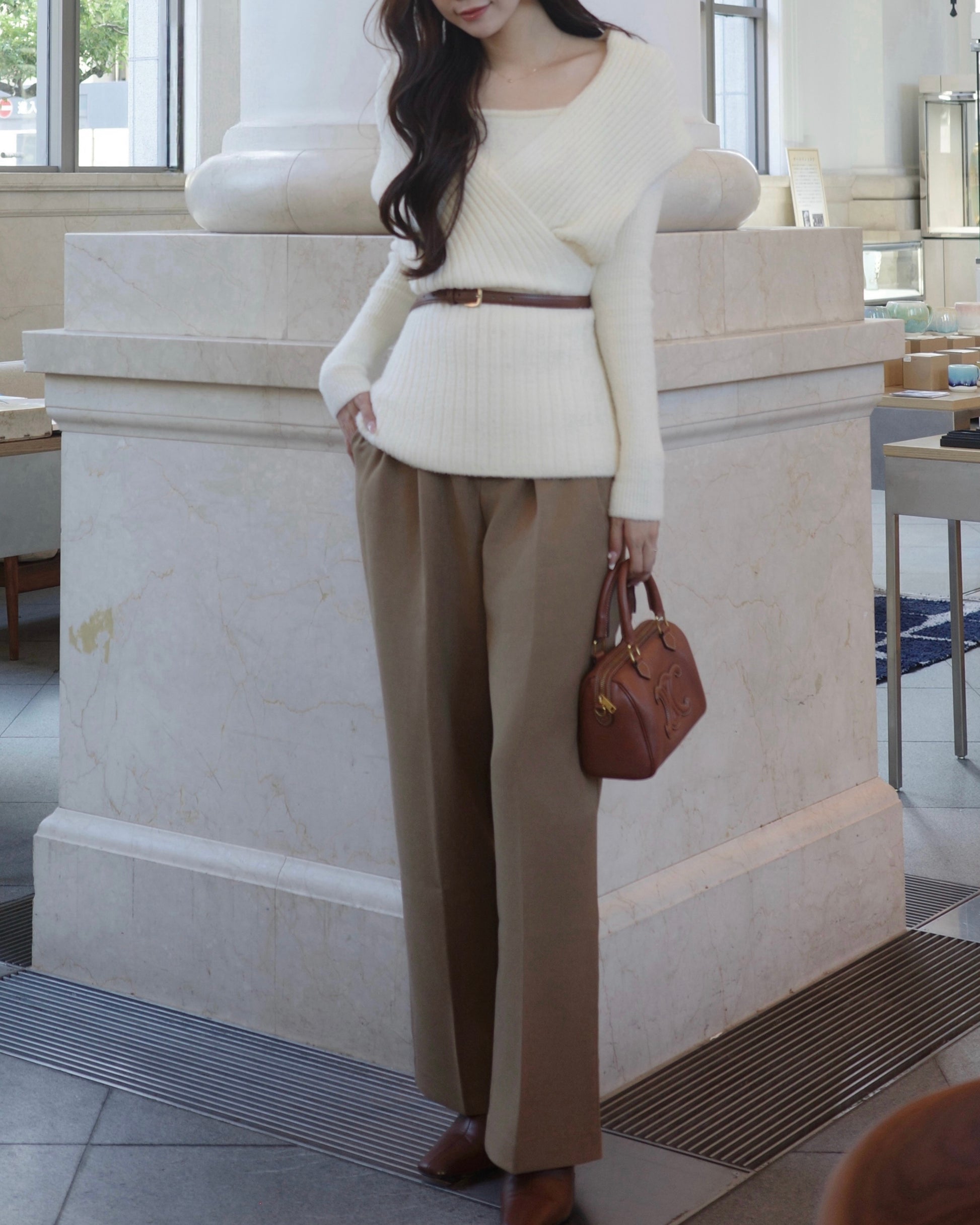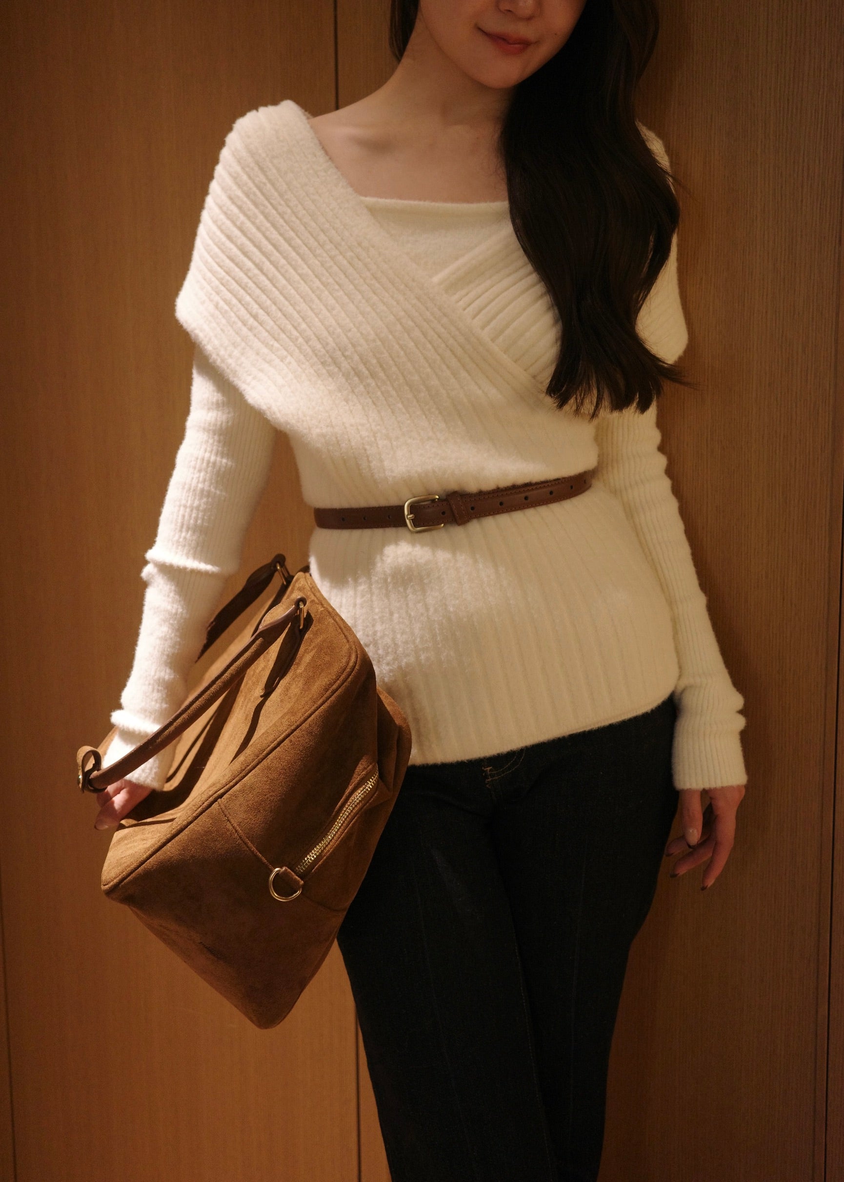 ベルト付きでスタイルにアクセントを加えられる、カシュクールデザインのオフショルダーニットトップス。