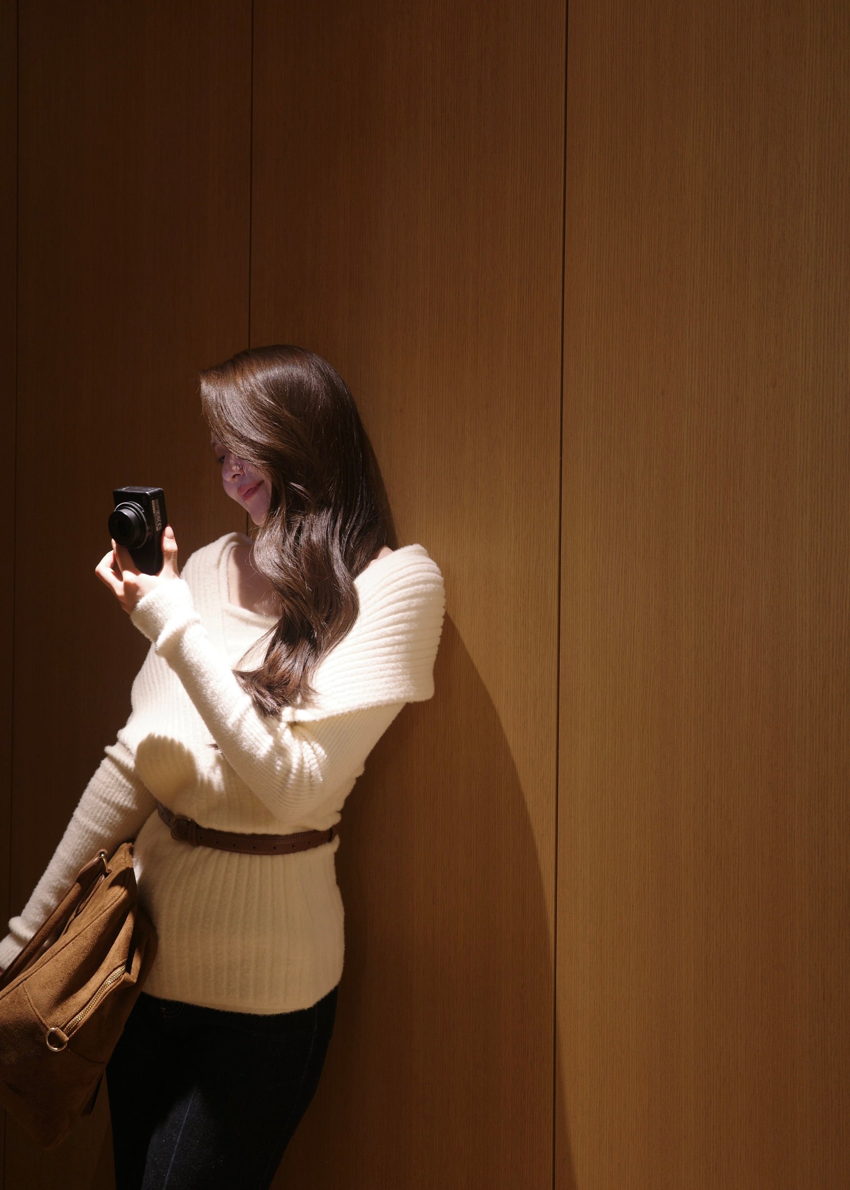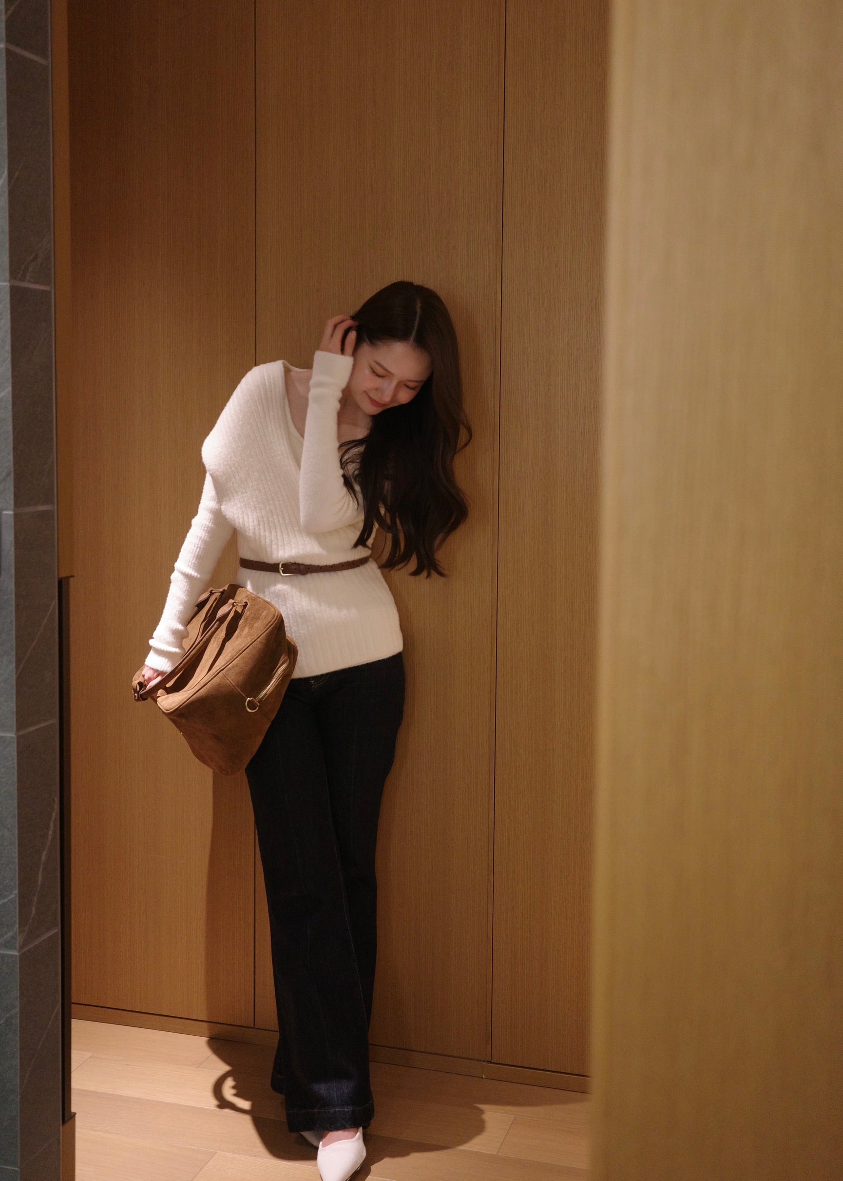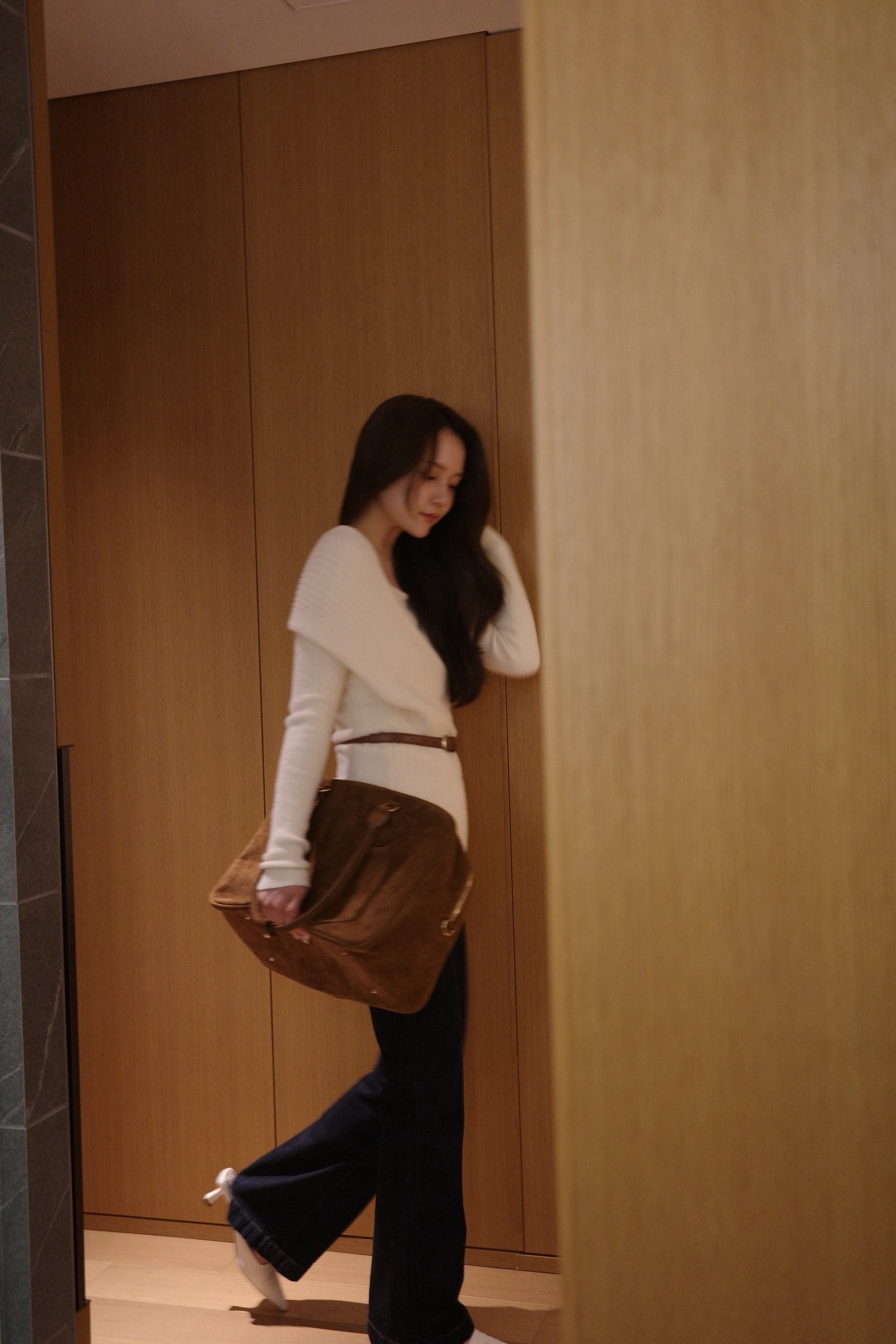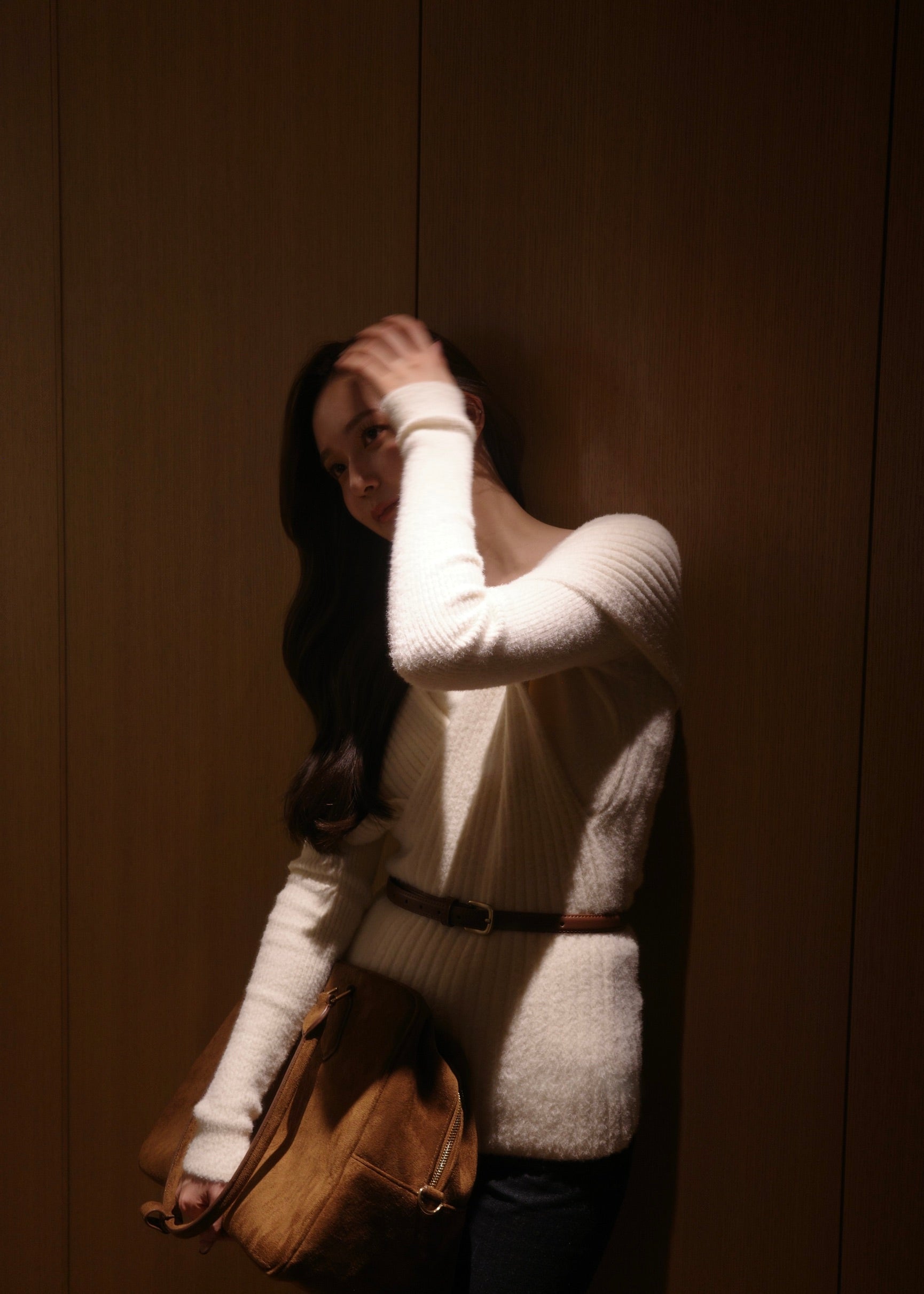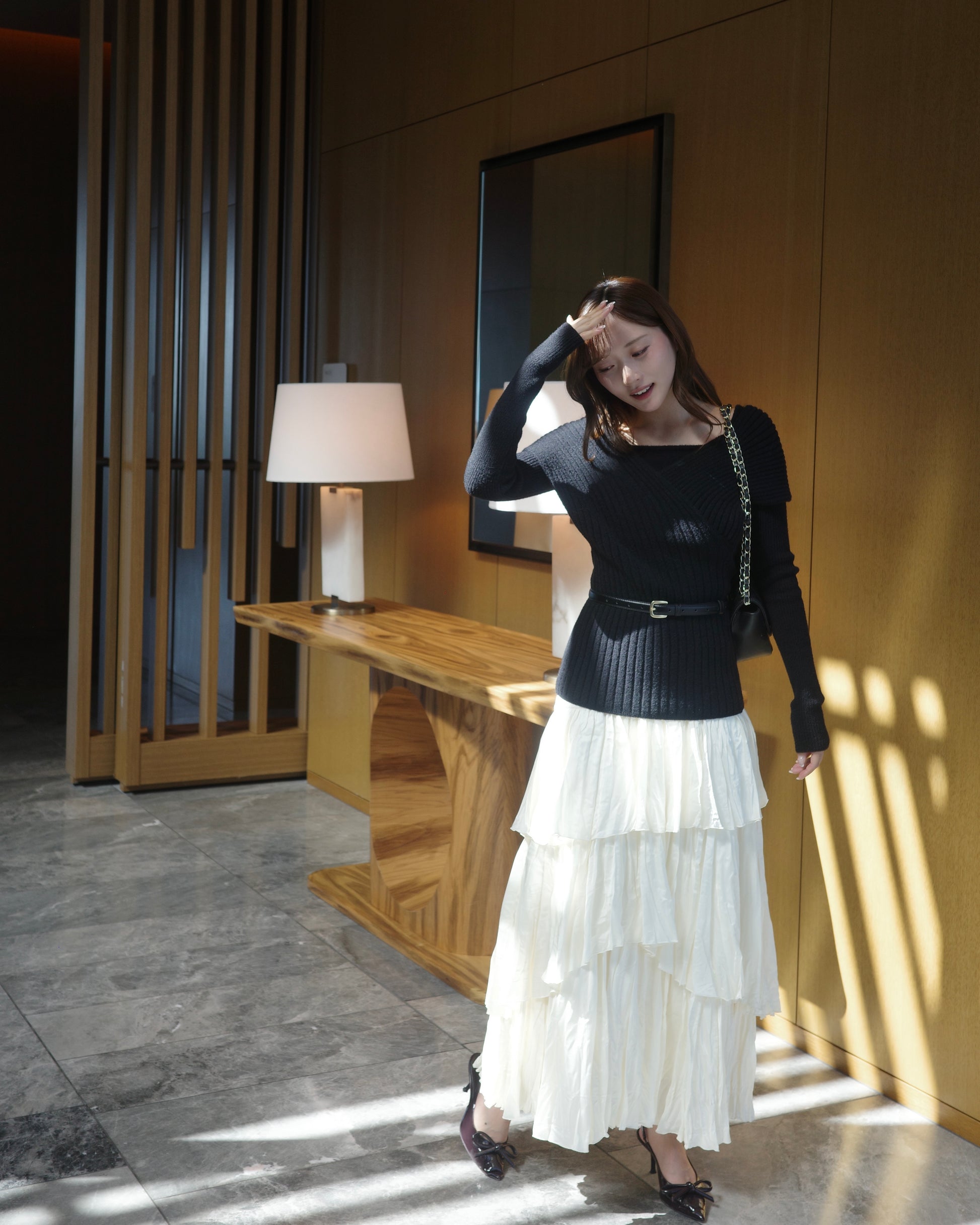 ベルト付きでスタイルにアクセントを加えられる、カシュクールデザインのオフショルダーニットトップス。