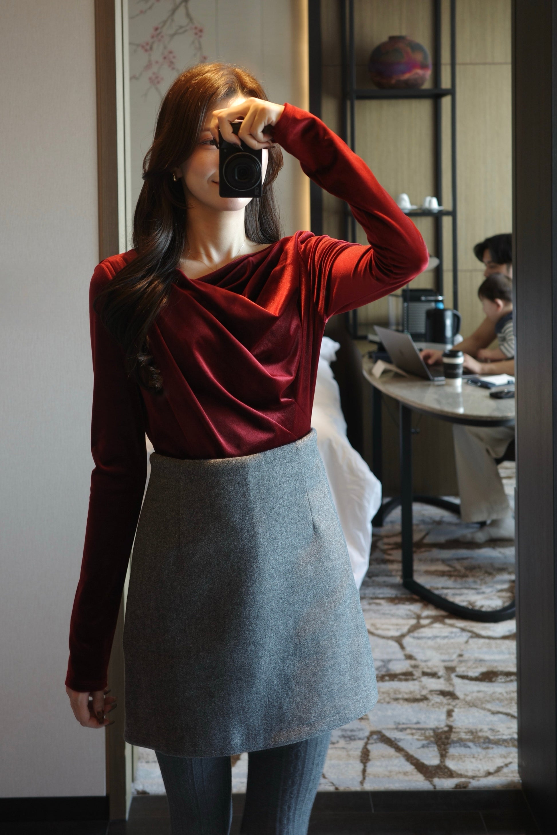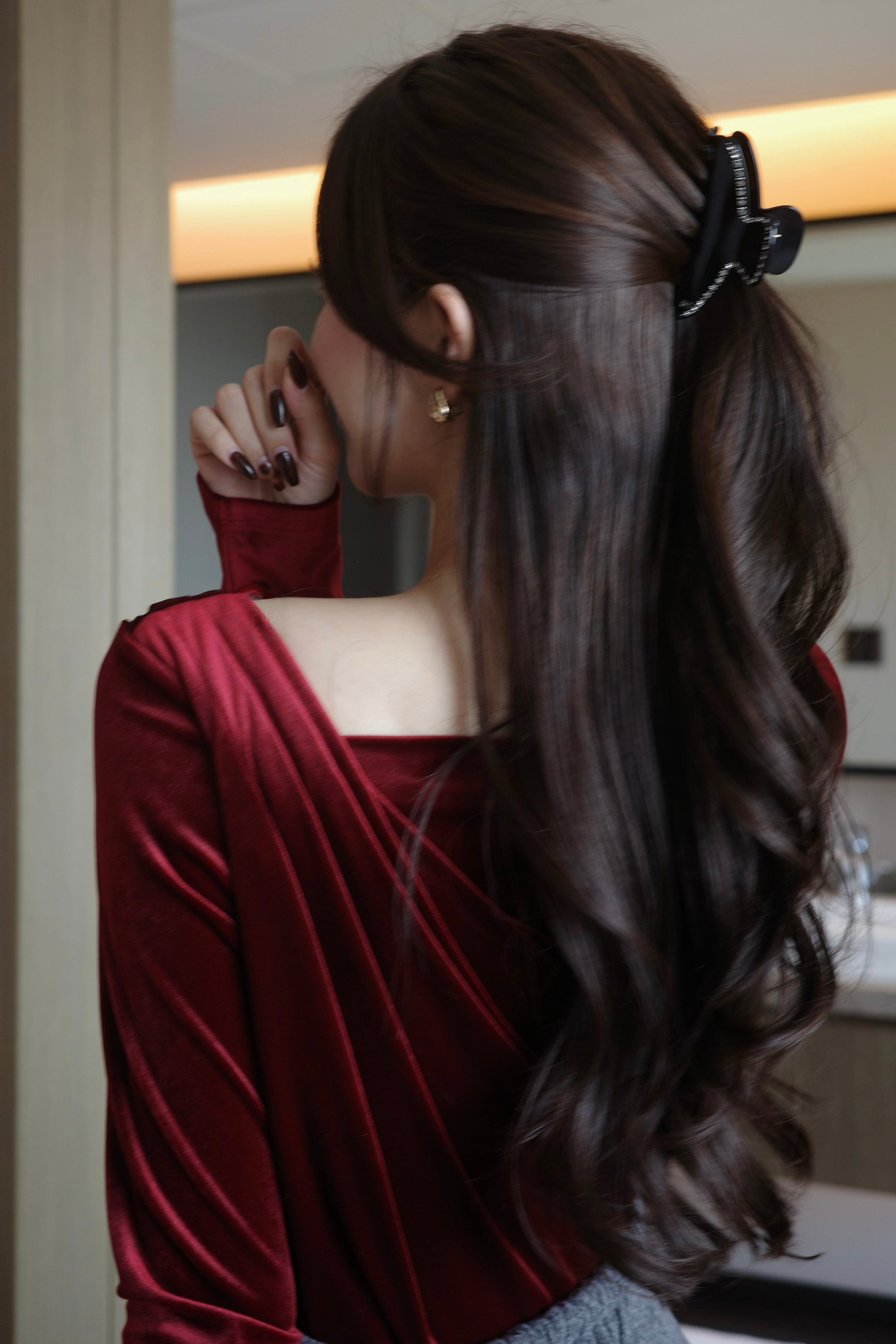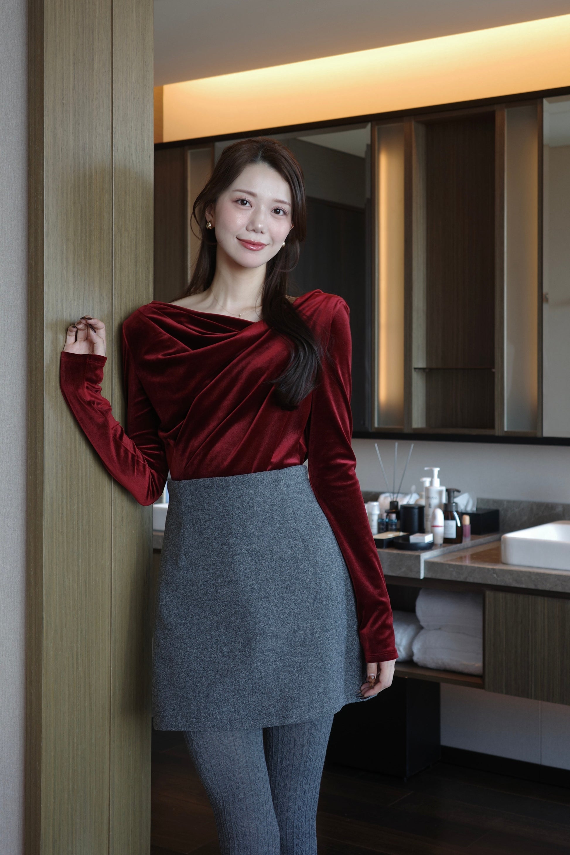 落ち感のあるベロアが動くたびに柔らかなドレープを描き、女性らしさと品のある華やかさを演出。