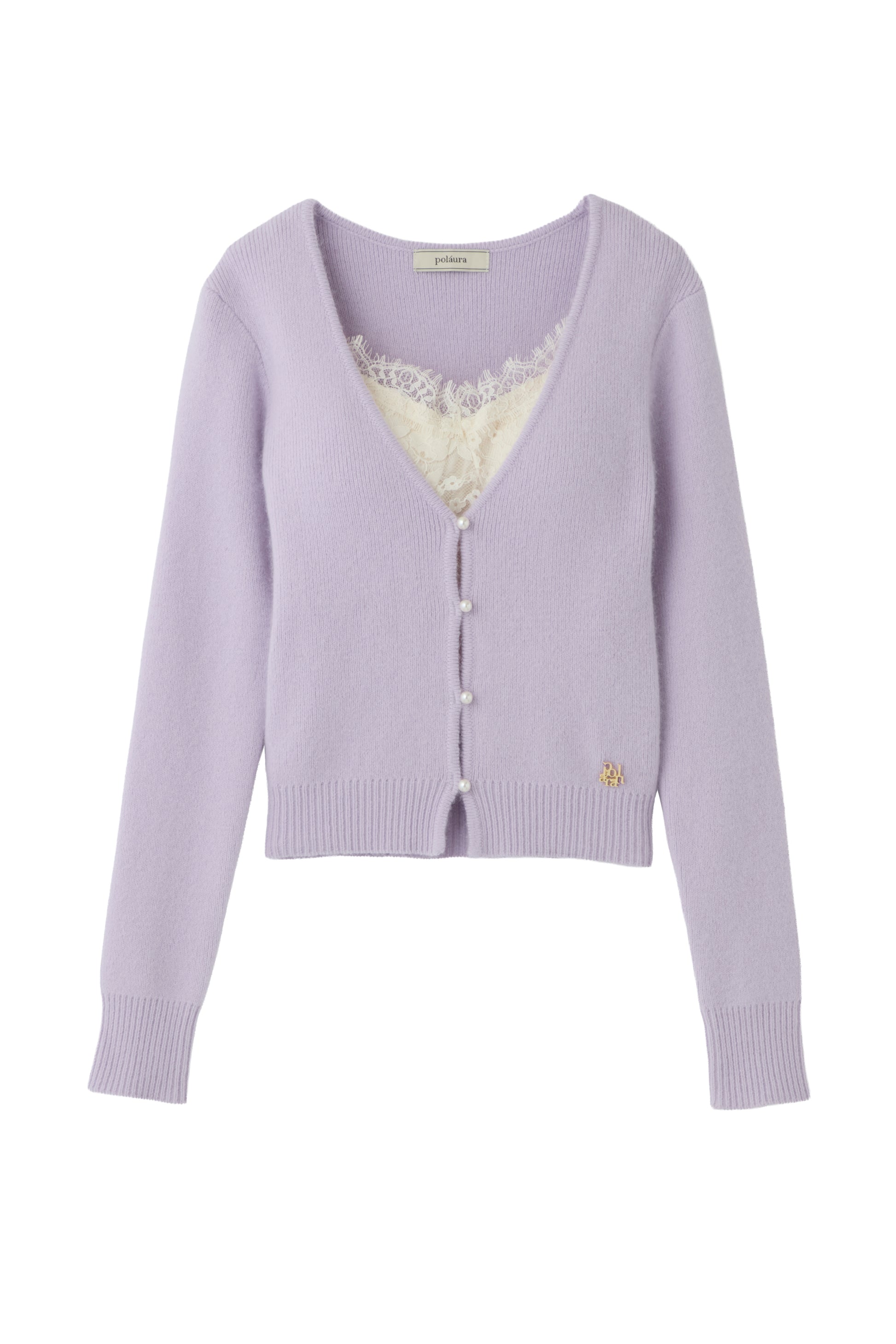 ウール混の上質な糸を使用し、ふんわりと軽やかな風合いに編み立てたニットカーディガンと、レースインナーがセットになったアイテム。フロントには上品なパールボタンをあしらい、シンプルながらも華やかさをプラスしました。深めに開いたネックラインは、セットのパット入りレースキャミソールとのレイヤードが美しく映える設計。やわらかな着心地と春らしいカラーバリエーションで、シーズンムードを高めてくれます。