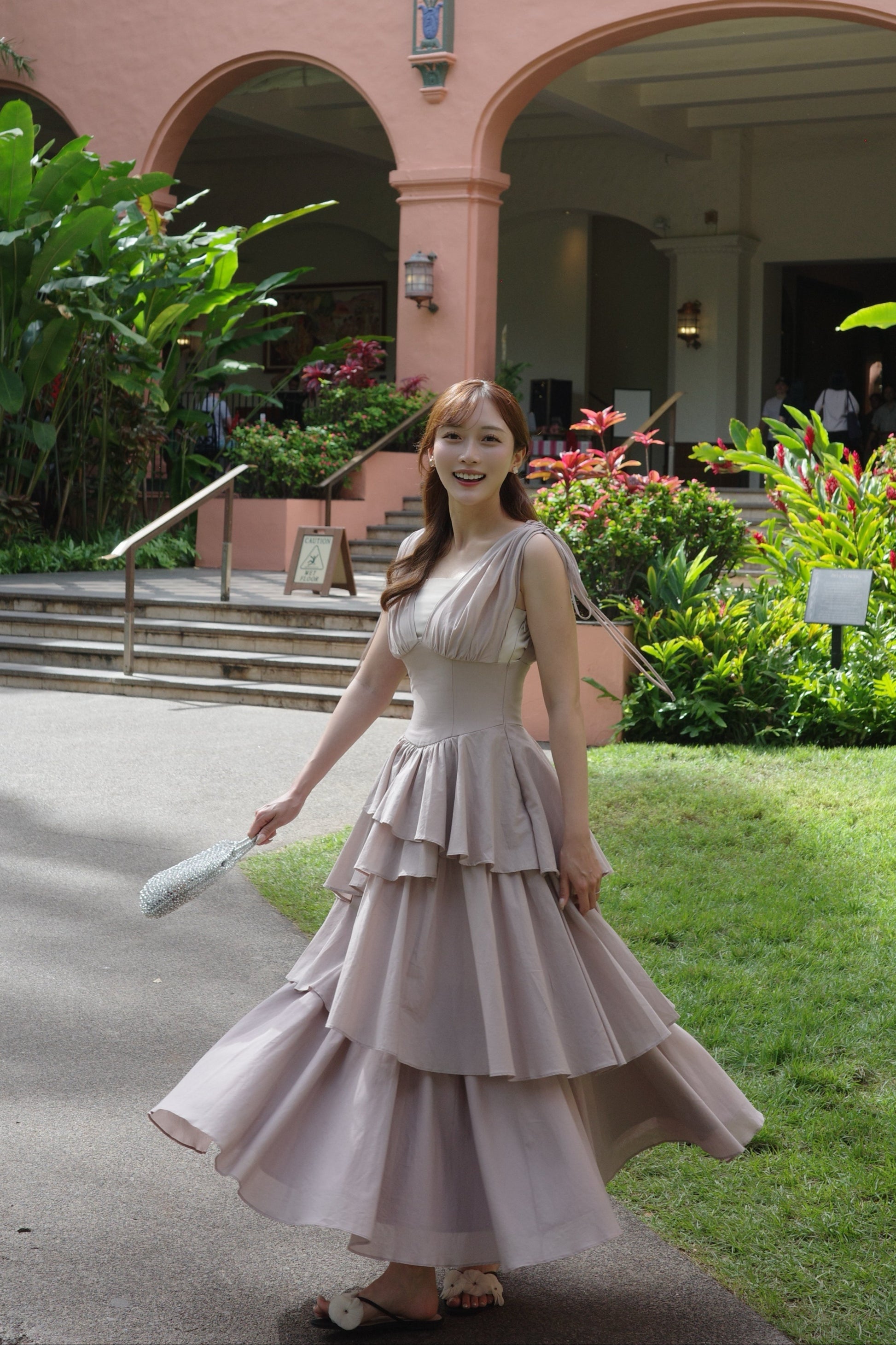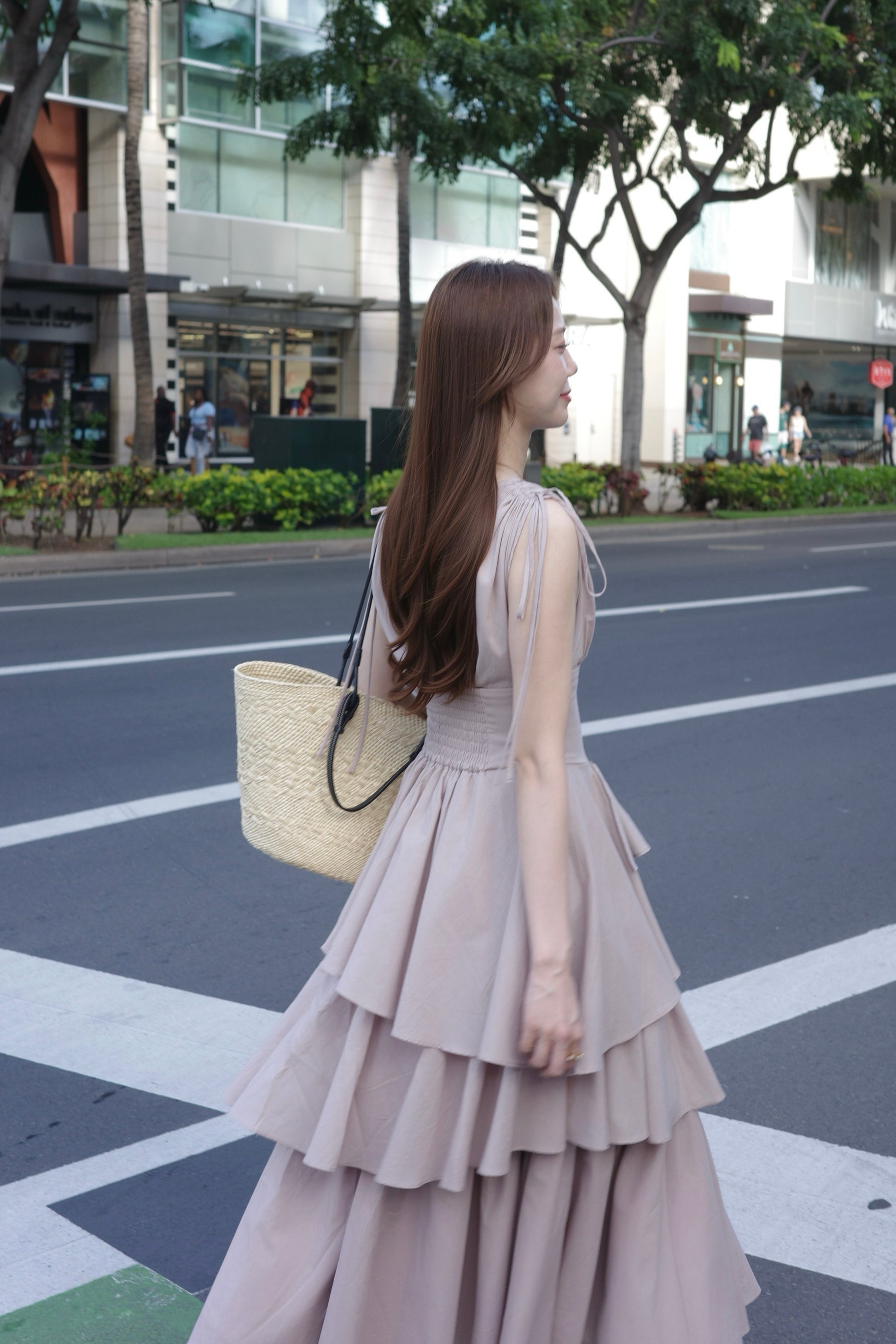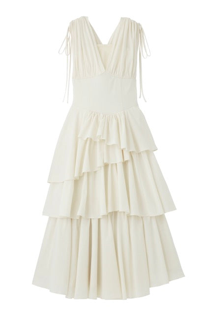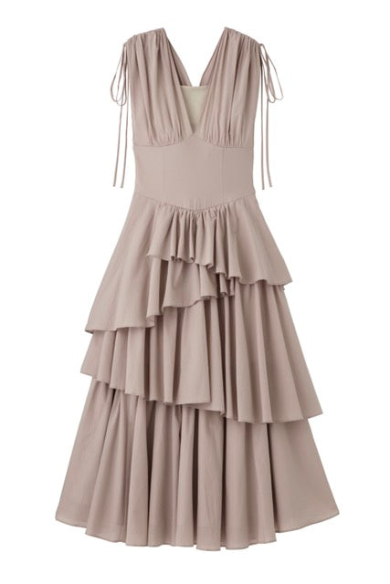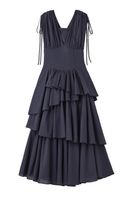 軽やかなコットンボイル素材を贅沢に使用したティアードワンピース。ふんだんに分量感を持たせたランダムティアードが、動くたびに空気を含んで美しくドラマティックに揺れ広がります。肩から流れるギャザーが女性らしさを引き立てつつ、上半身はビスチェ風のデザインですっきりとした印象に。滑り止めテープ付きの胸当てをドッキングすることで、安心感のある着心地と美しいシルエットを両立しました。
