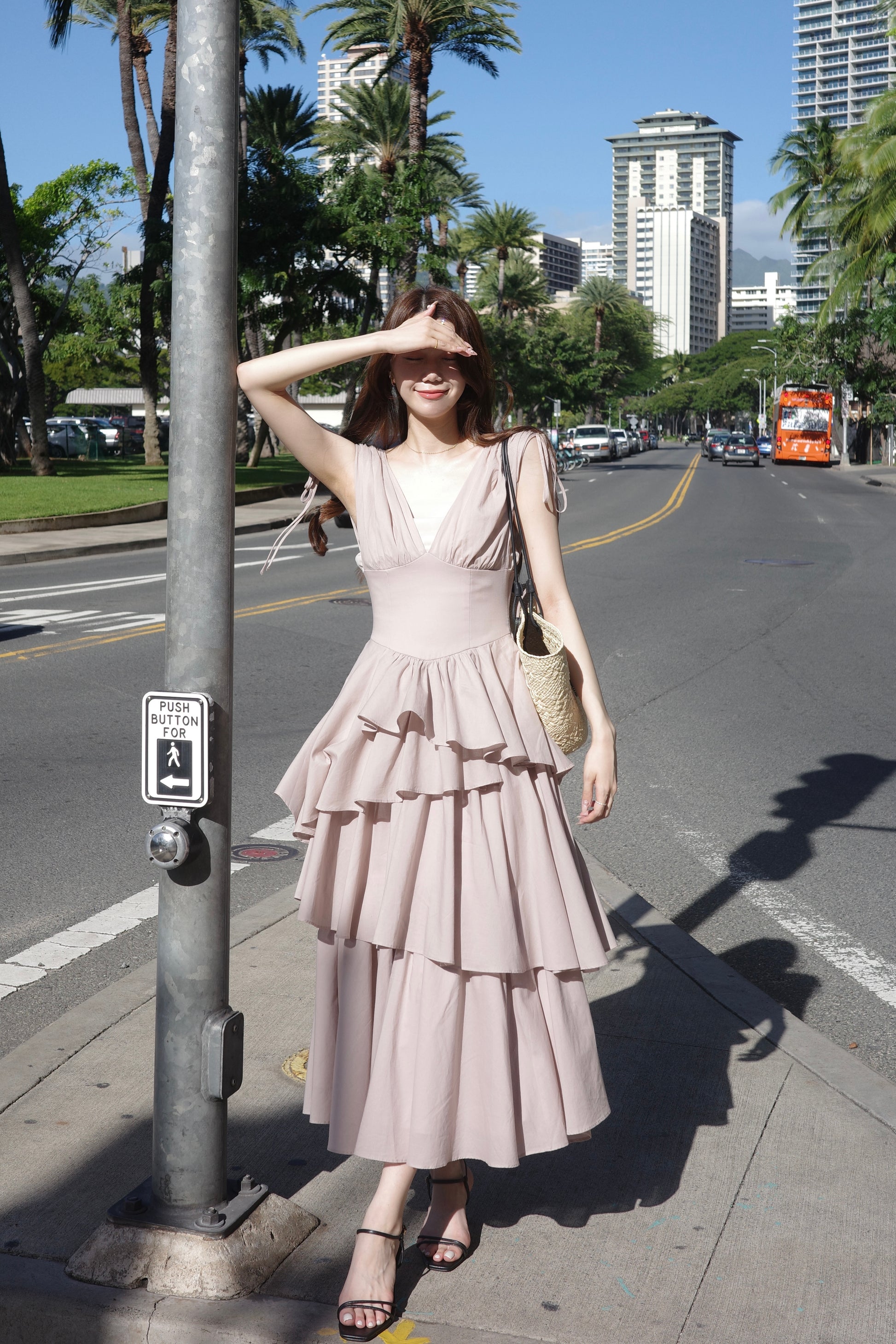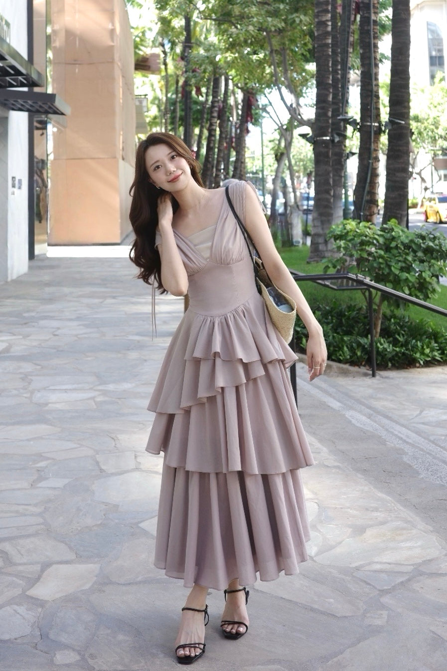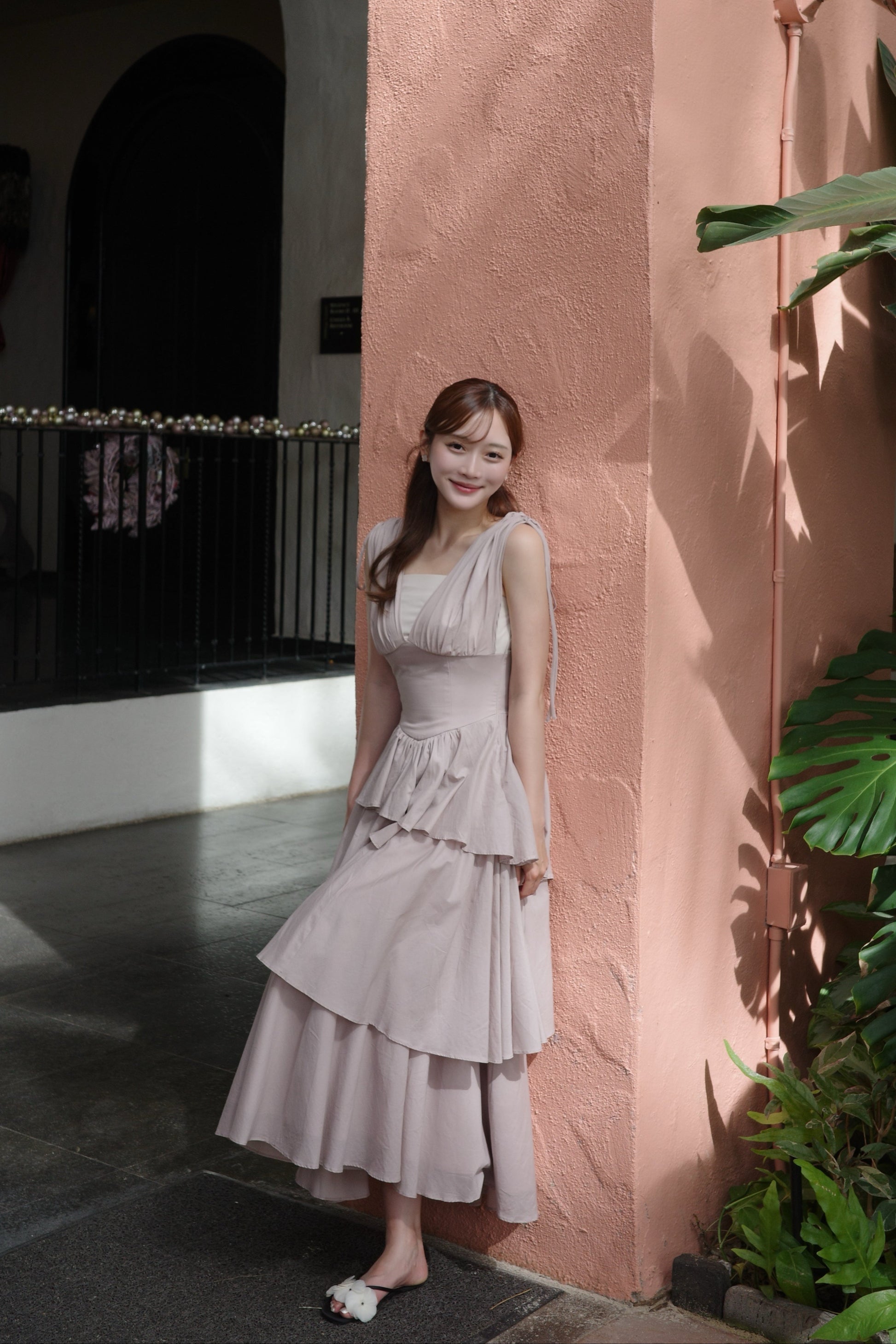 軽やかなコットンボイル素材を贅沢に使用したティアードワンピース。ふんだんに分量感を持たせたランダムティアードが、動くたびに空気を含んで美しくドラマティックに揺れ広がります。肩から流れるギャザーが女性らしさを引き立てつつ、上半身はビスチェ風のデザインですっきりとした印象に。滑り止めテープ付きの胸当てをドッキングすることで、安心感のある着心地と美しいシルエットを両立しました。