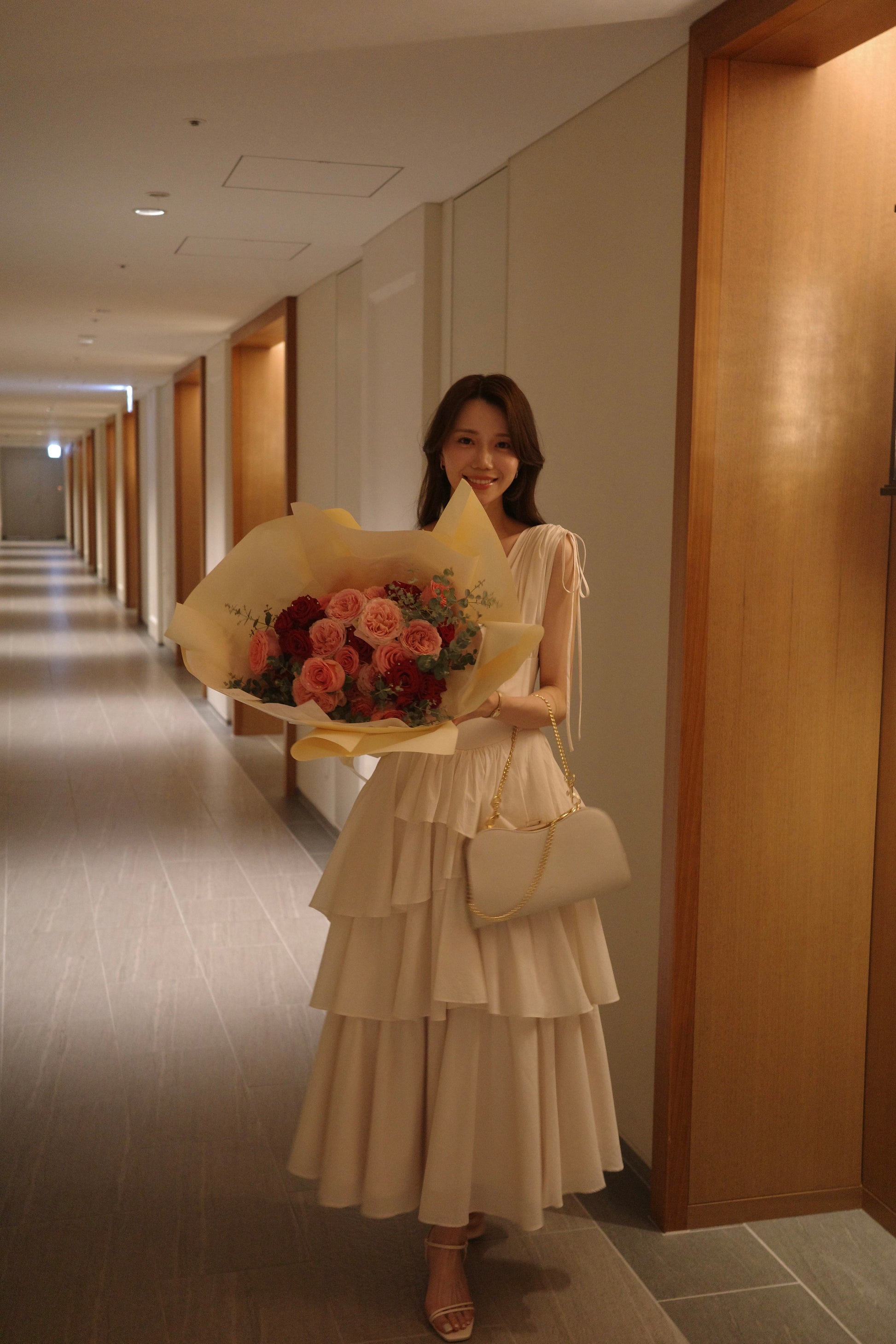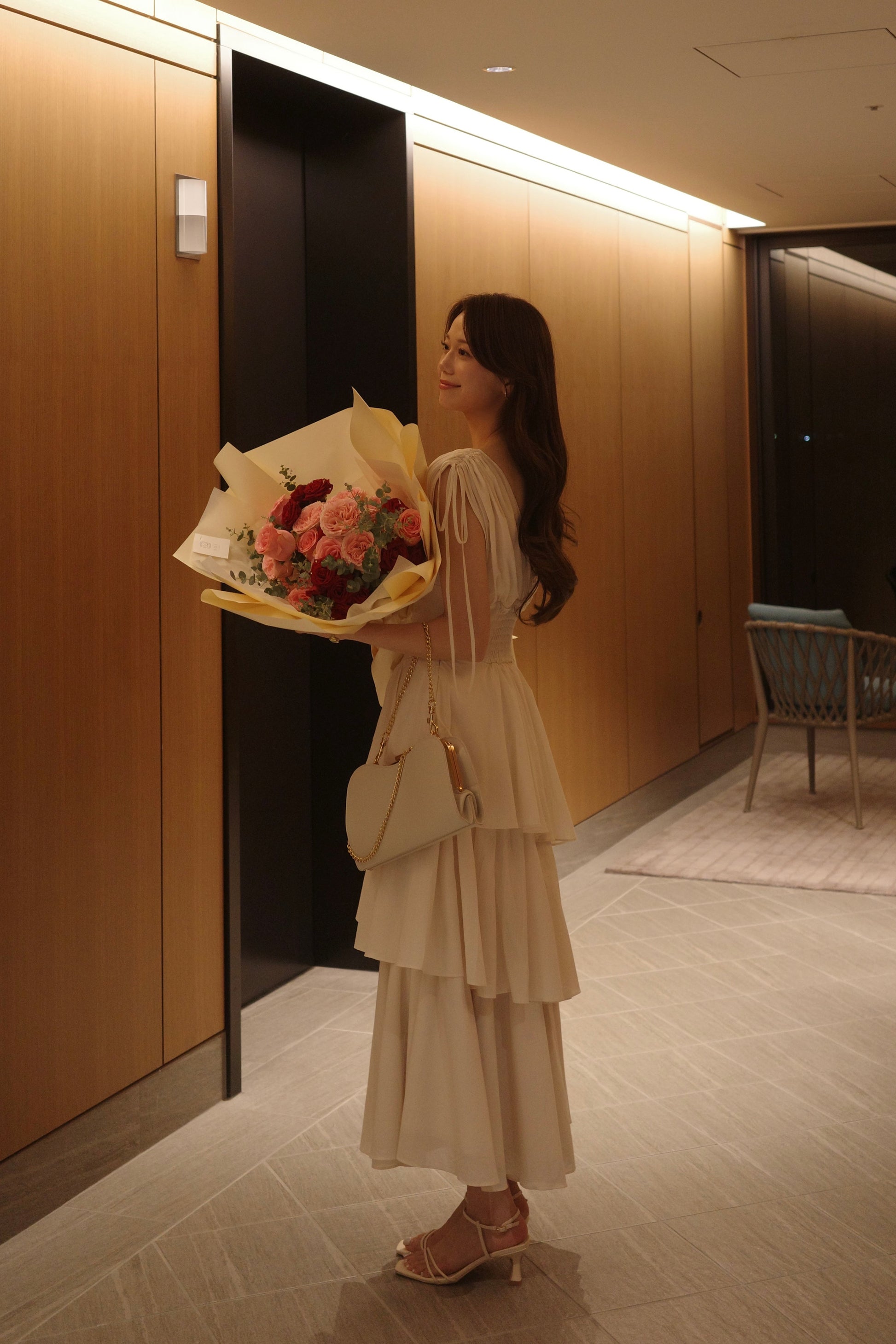 ふんだんに分量感を持たせたランダムティアードが、動くたびに空気を含み、美しくドラマティックに揺れ広がります。